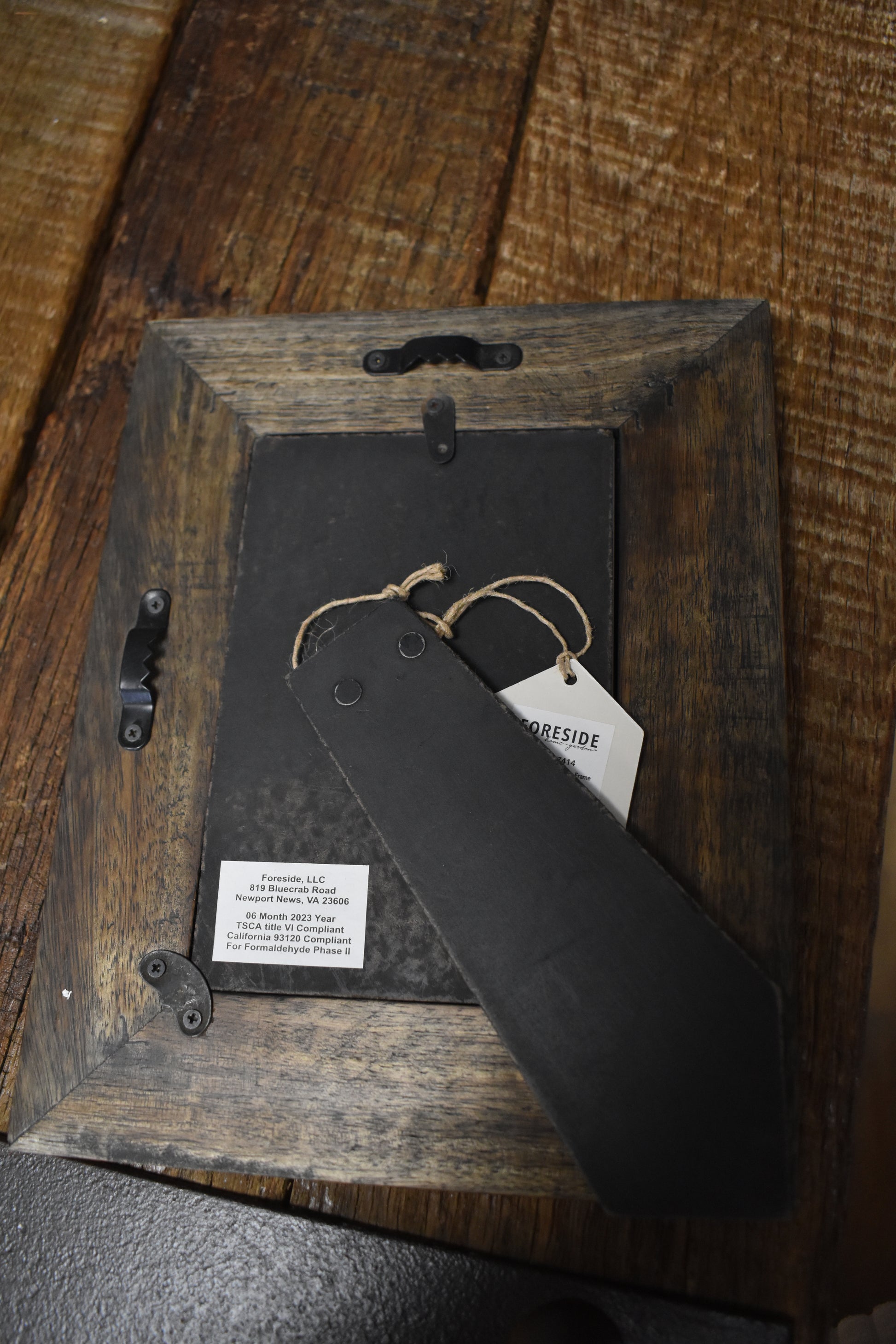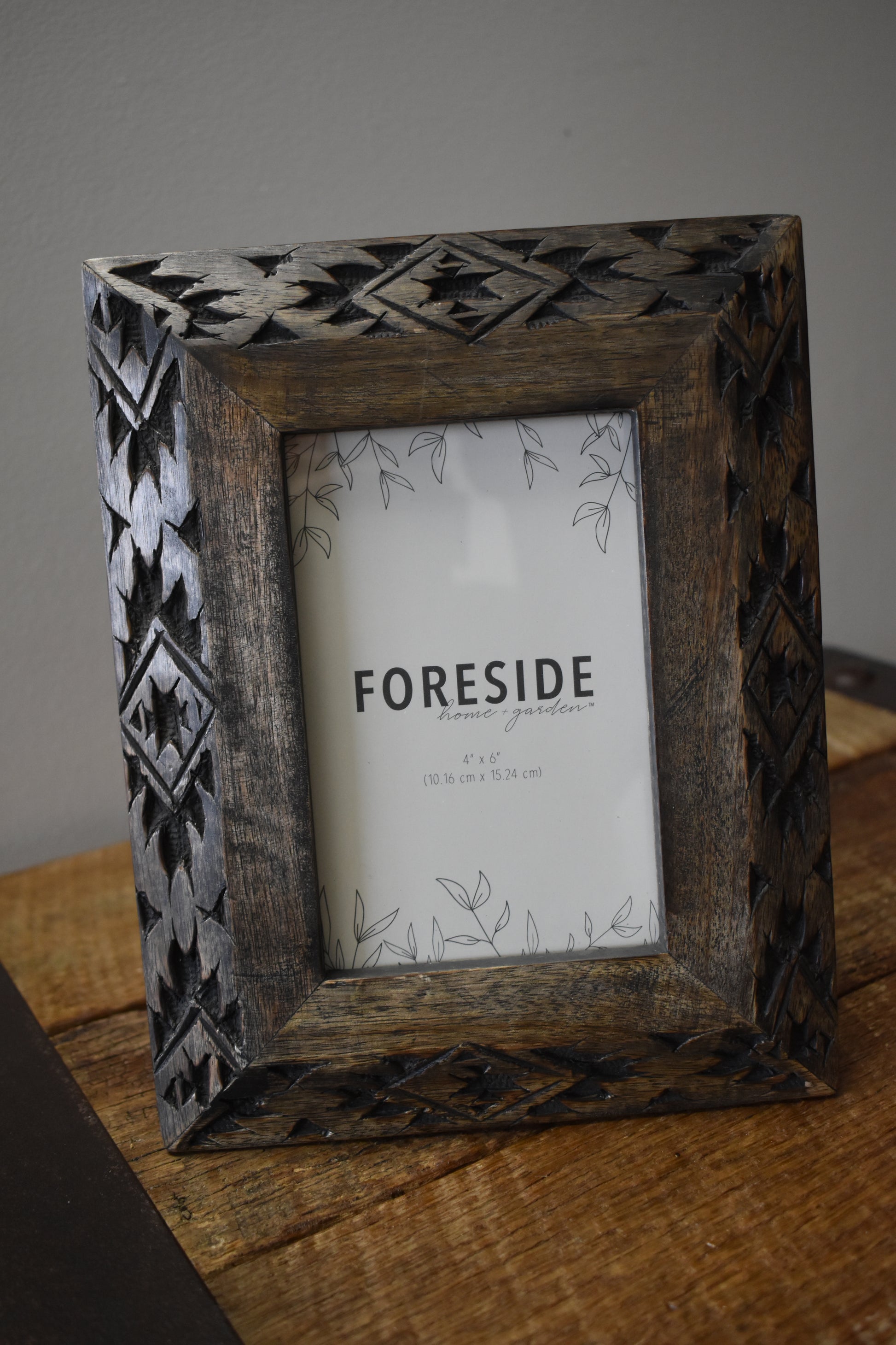 -The wood picture frame features a distressed black tribal pattern and holds a 4 x 6 photo. With its rustic style, this frame will fit perfectly with your favorite decor.