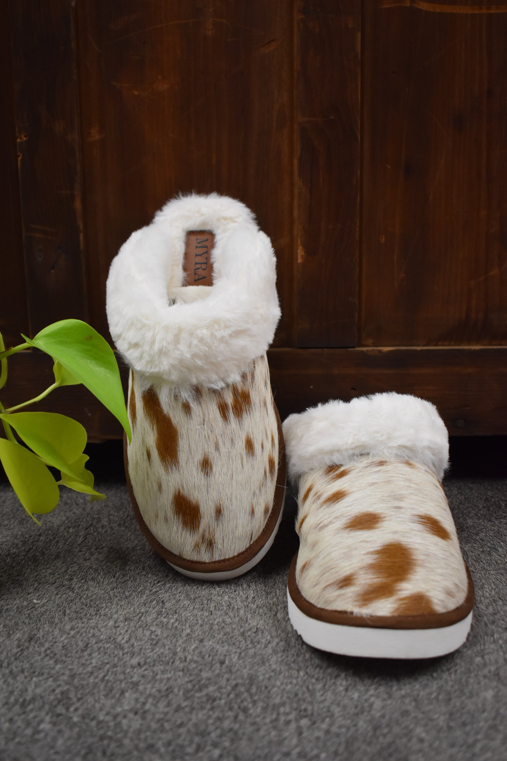 Adorable fur-lined cowhide slippers with thick white sole & brown trim.