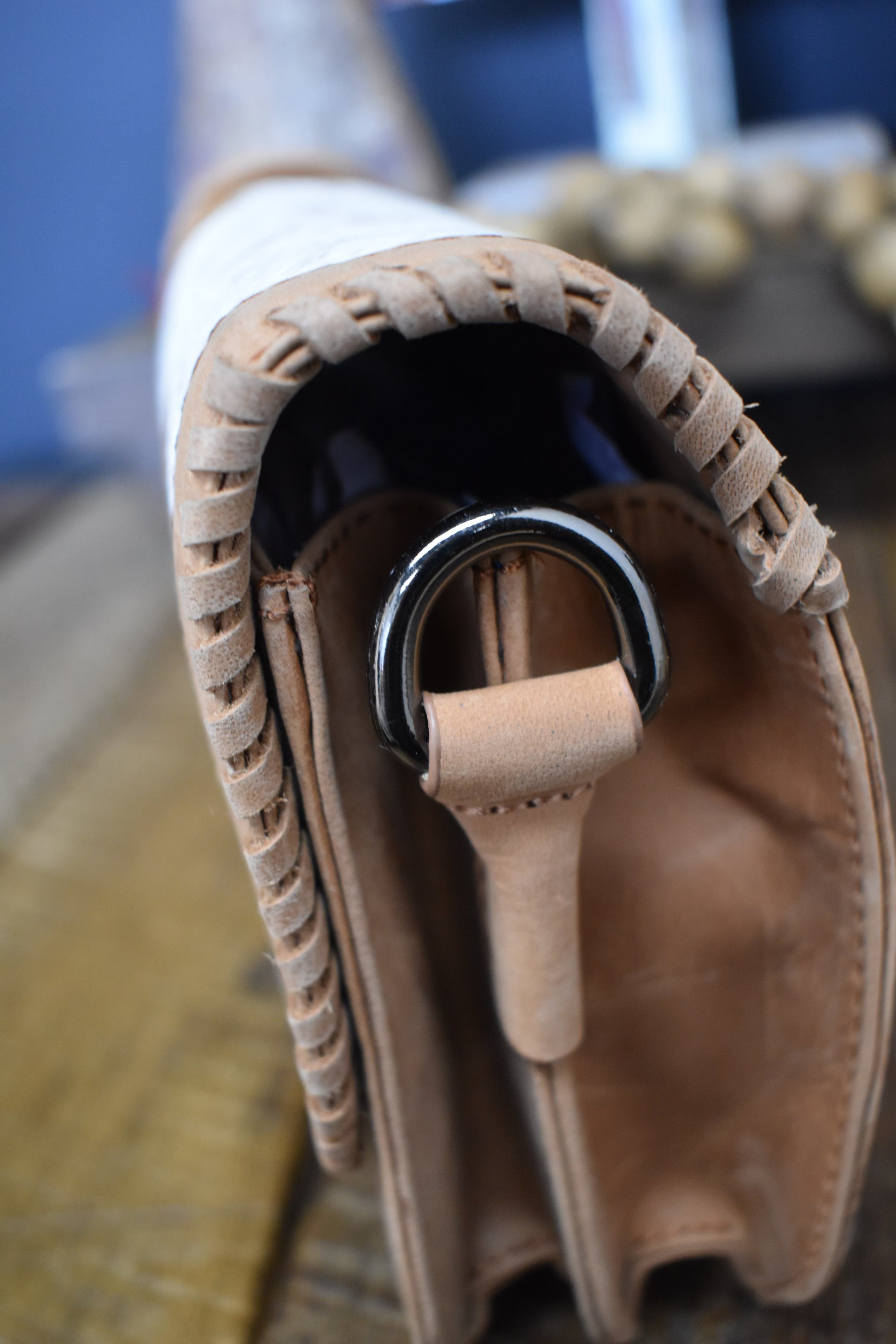Light brown & white cowhide purse with sturdy weaving rustic detail, adjustable crossbody detachable strap, handy inside pocket & secure clasp closure.