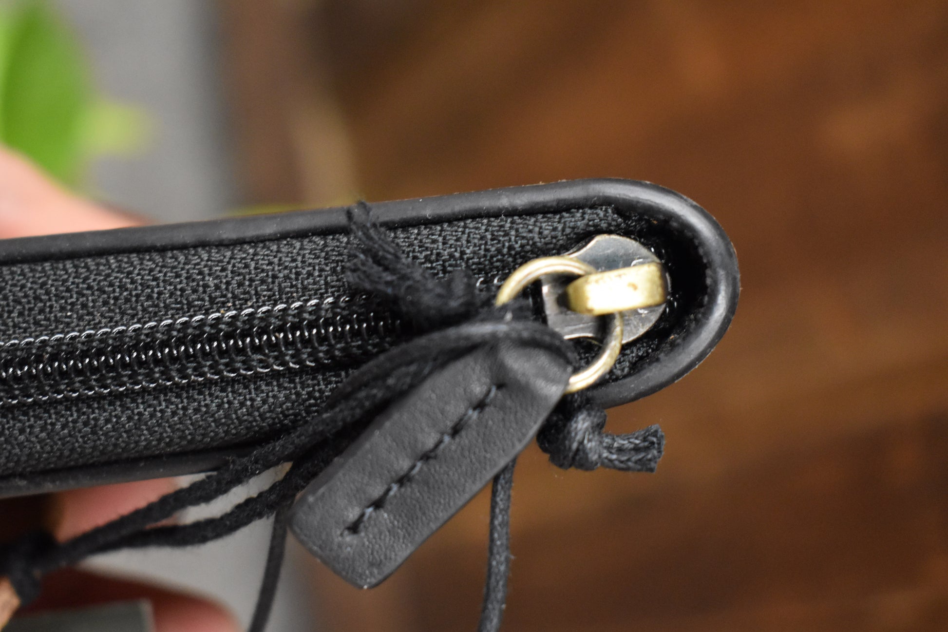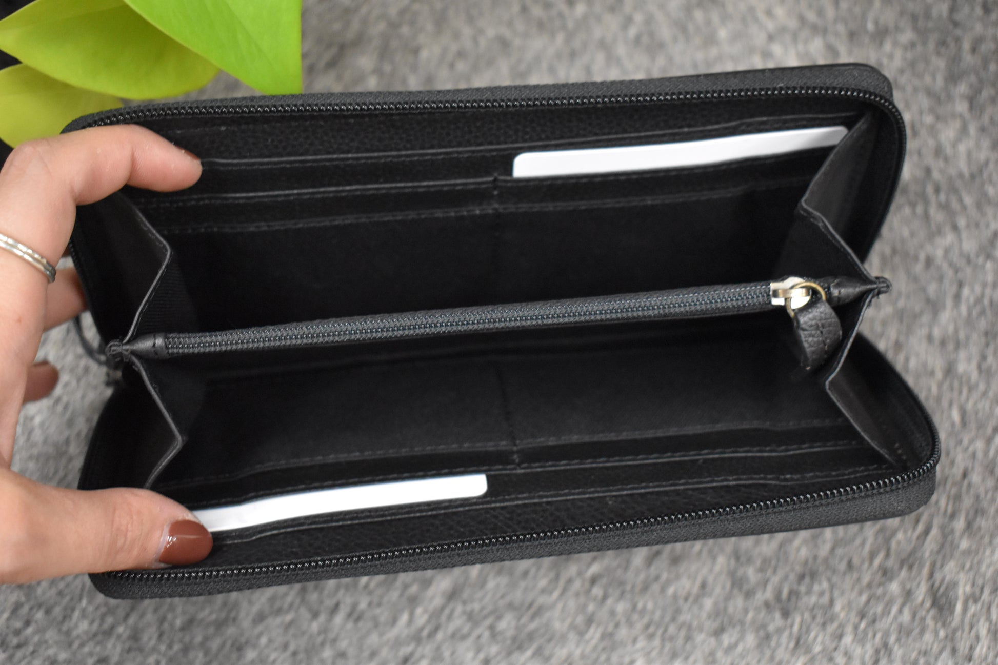 Double sided card holder, coin pouch in between, & two cash pockets.ย