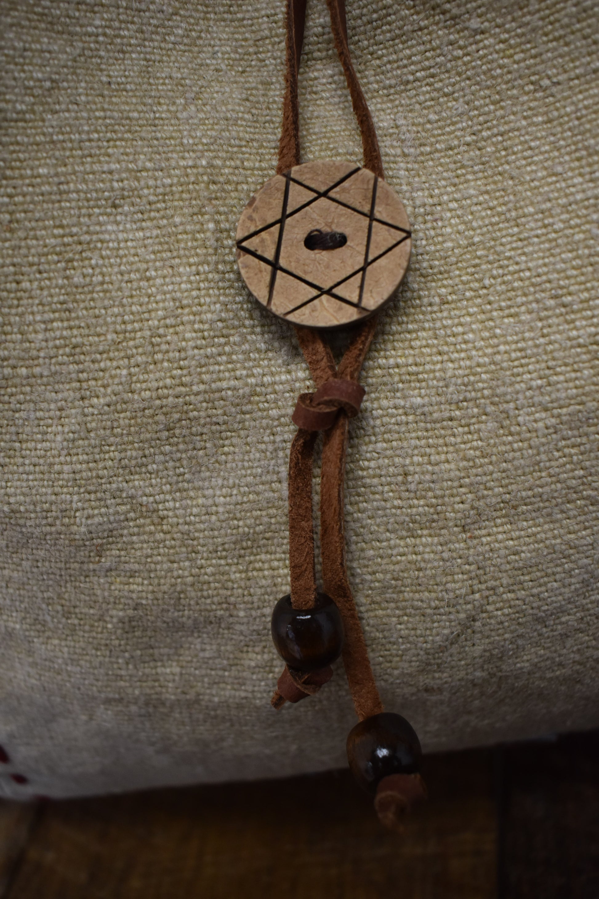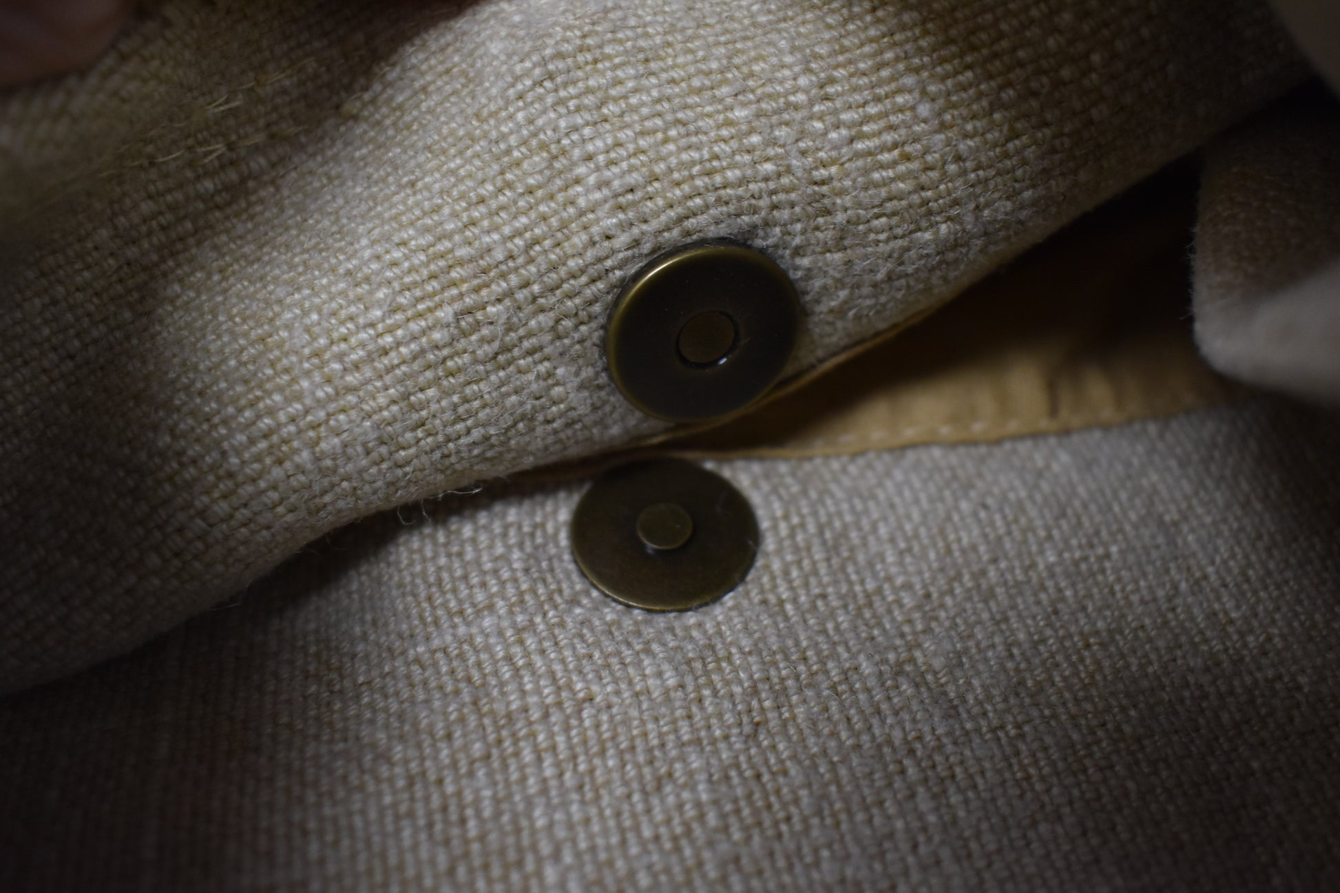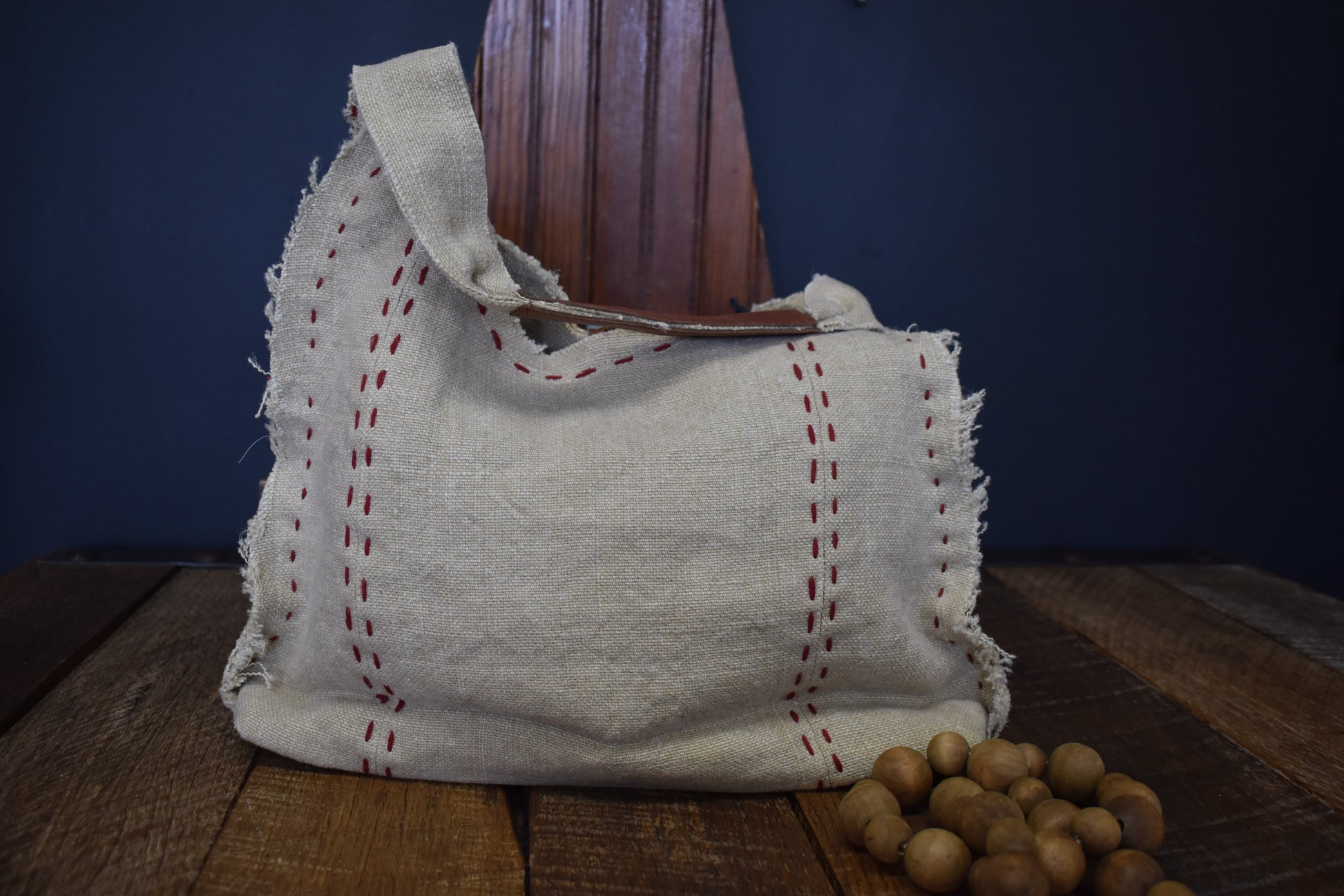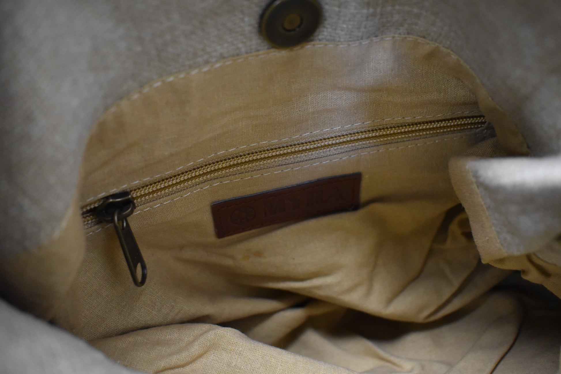 Upcycled Cotton & Jute canvas constructed bag, distinct leather handle, inside pocket, light weight design.