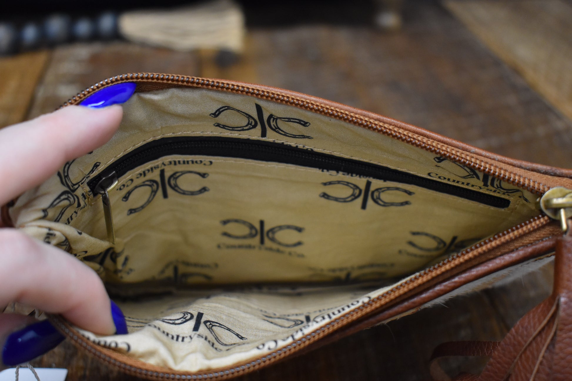 Adorable wristlet with cowhide checkered pattern & leather tassel detail. Wristlet is detachable & inside side zipper pocket.