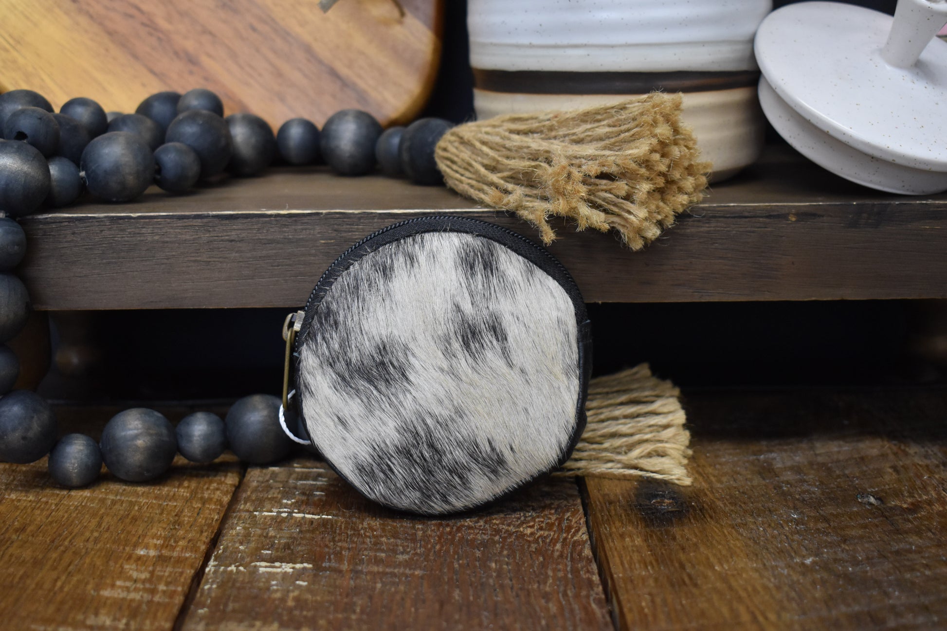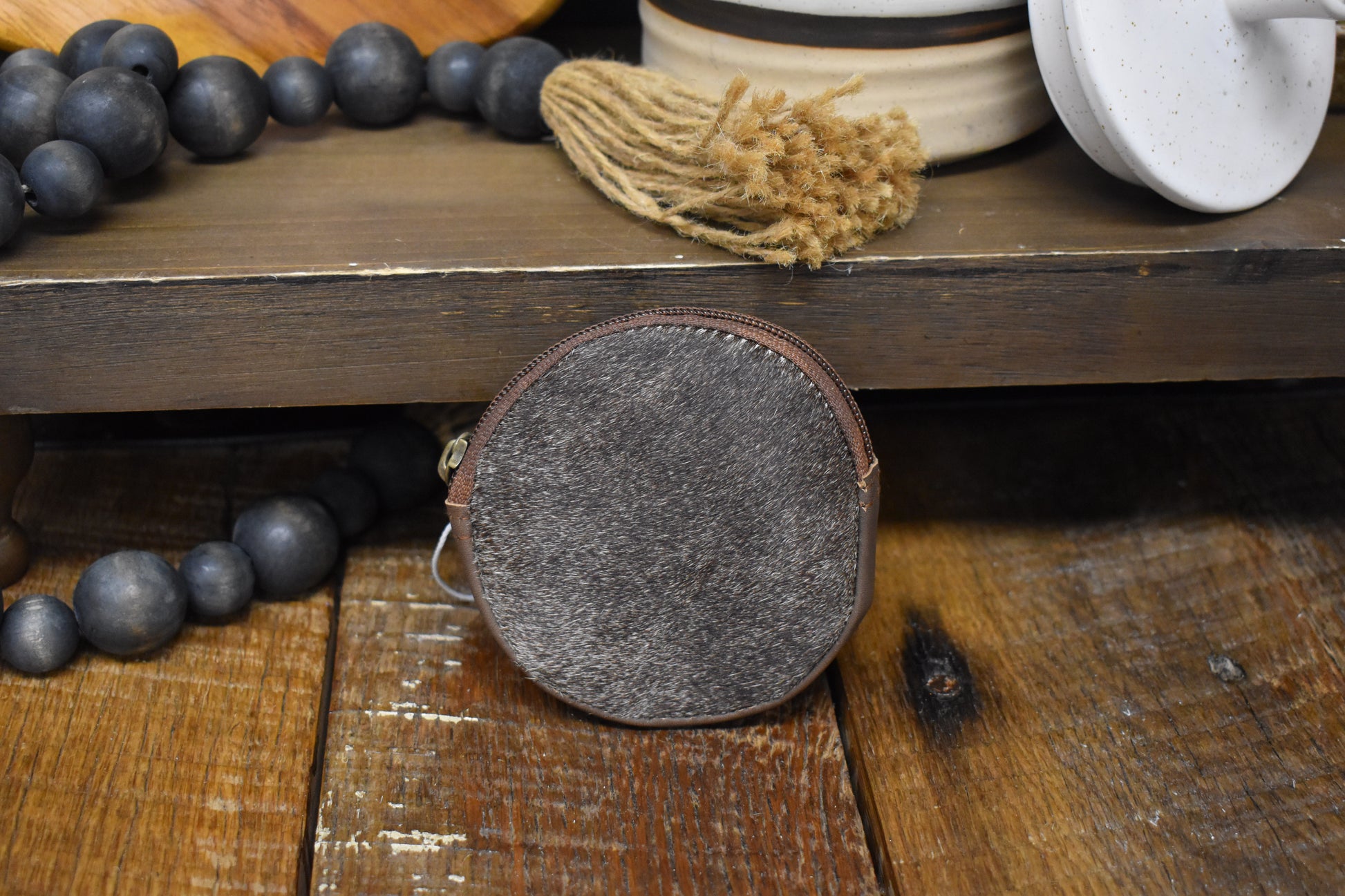 Cowhide circle pouch with cowhide front, leather back & top zipper closure. It’s the perfect size to stash your essentials.