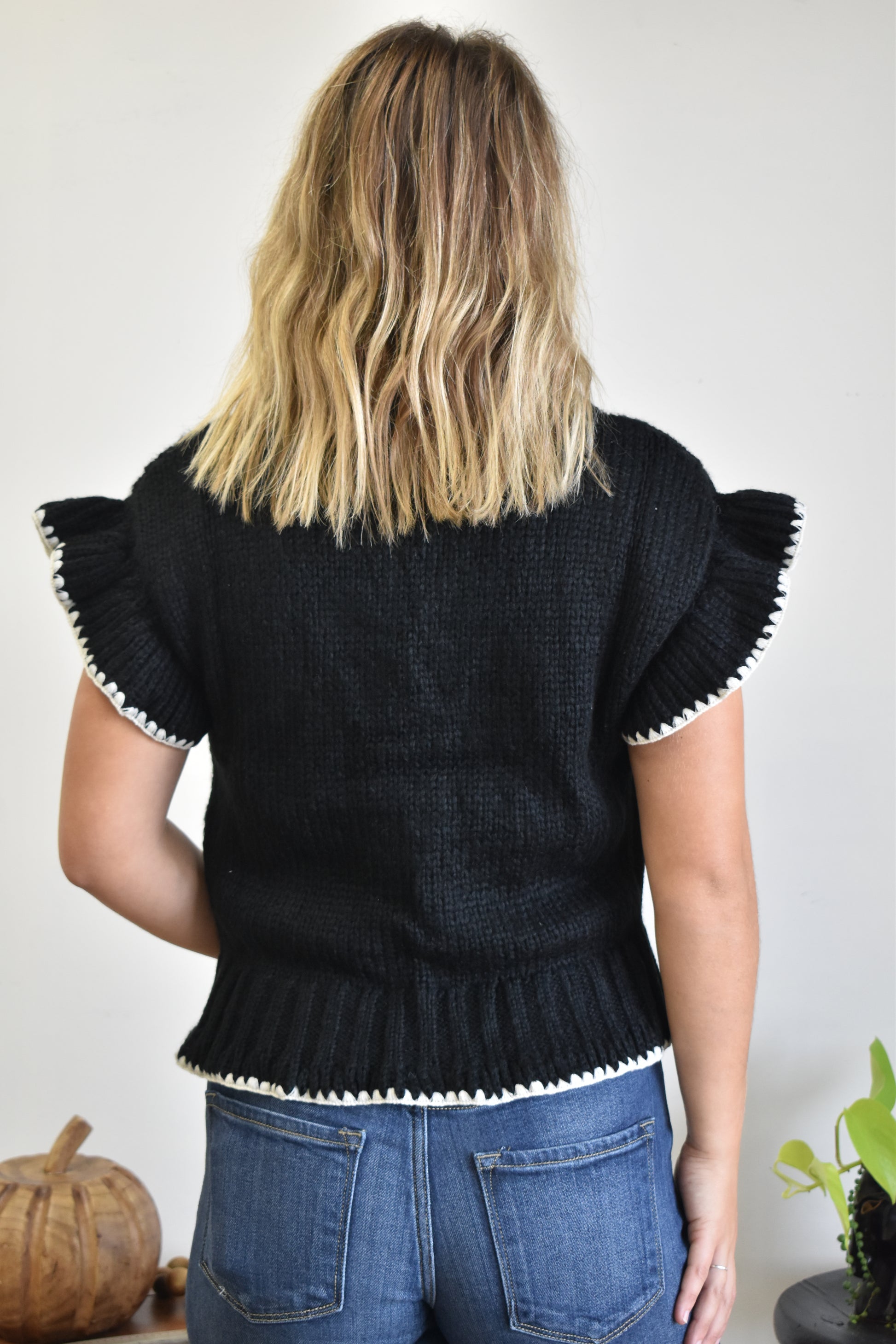 Black ruffle short sleeve, flowers stitched on front & 3 button front.