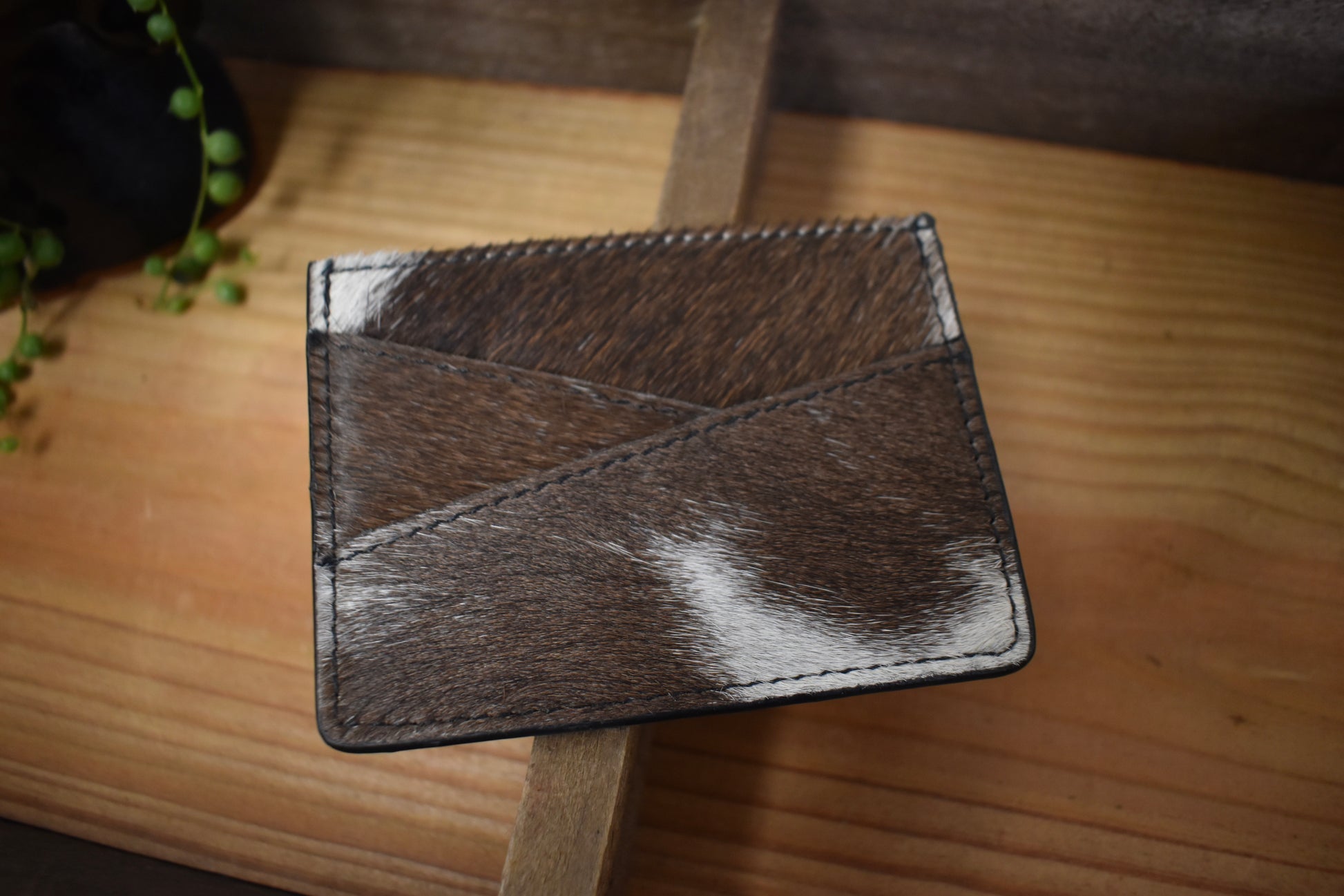 Cowhide cardholder with one large pocket and two crossover outside pockets.