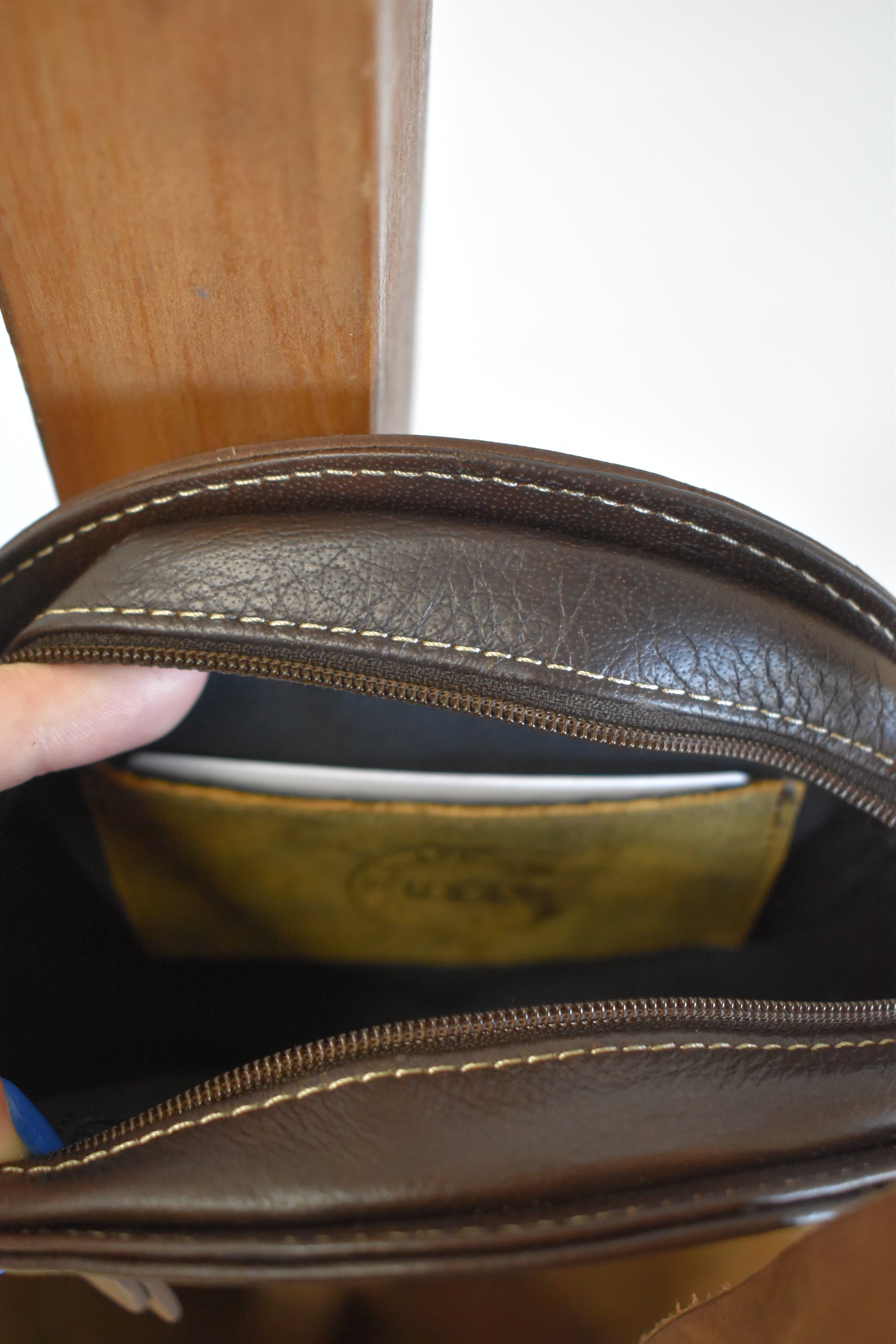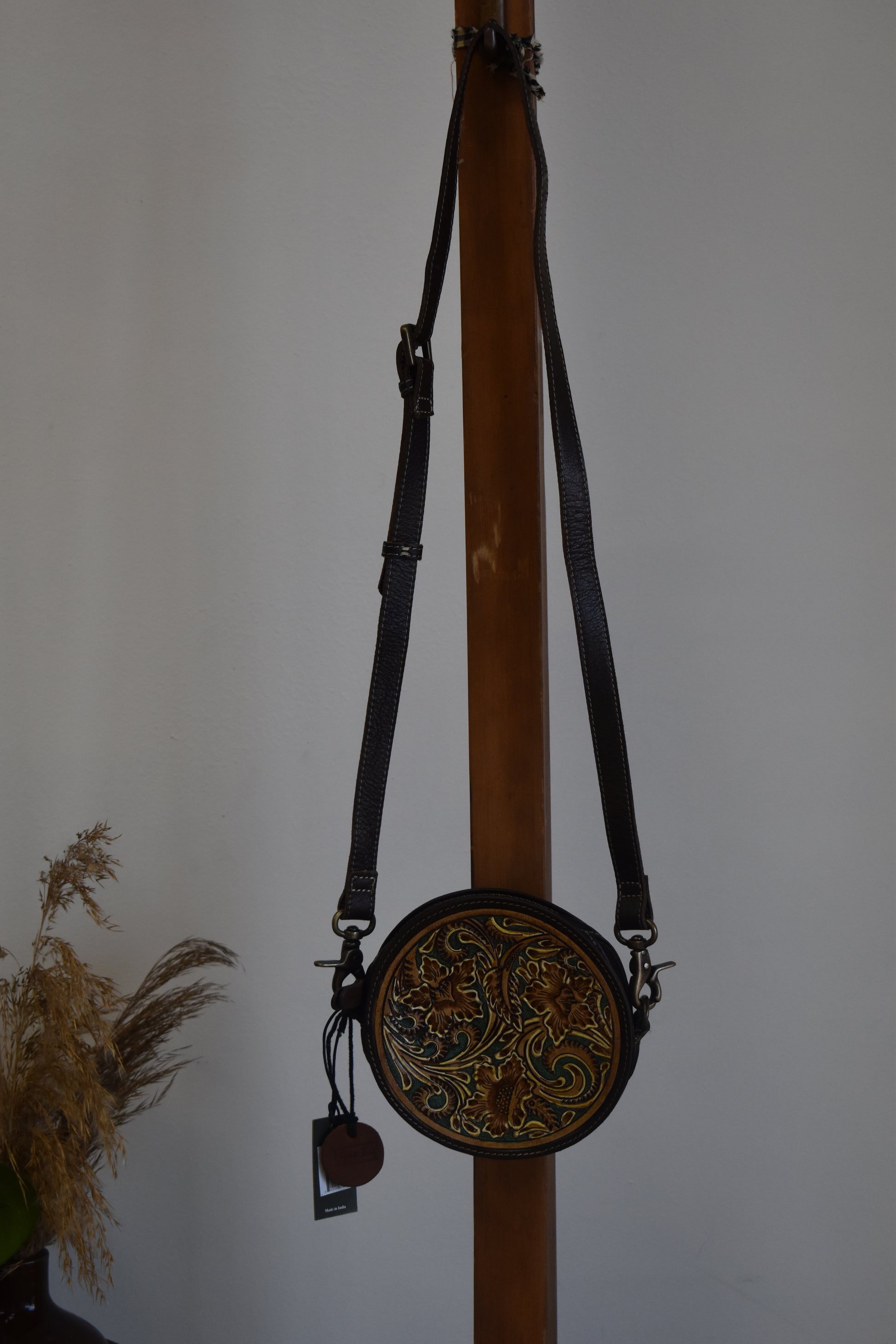 Dainty round crossbody coin purse with adjustable strap and zipper closure. Card holder and zipper pocket inside.