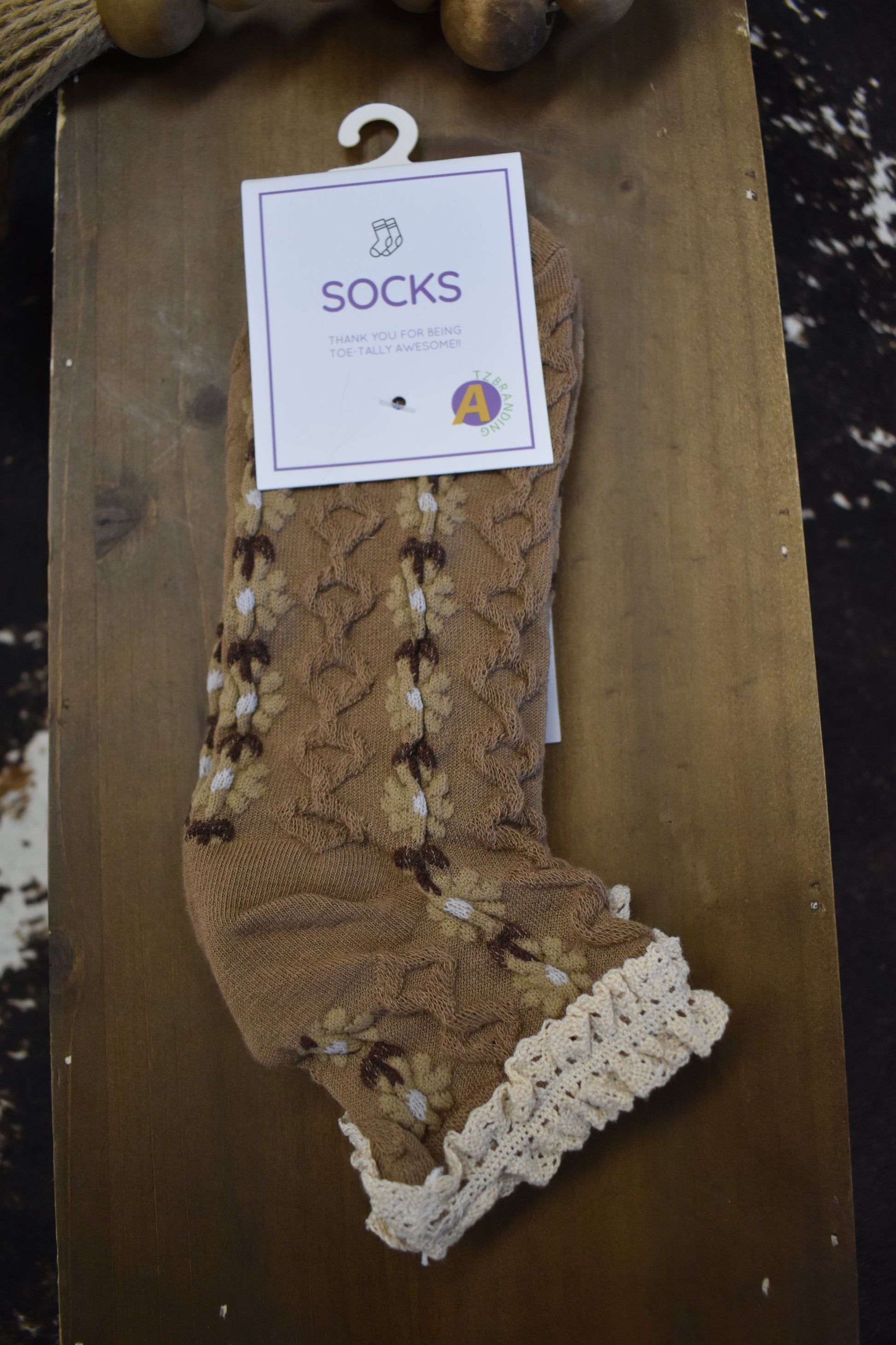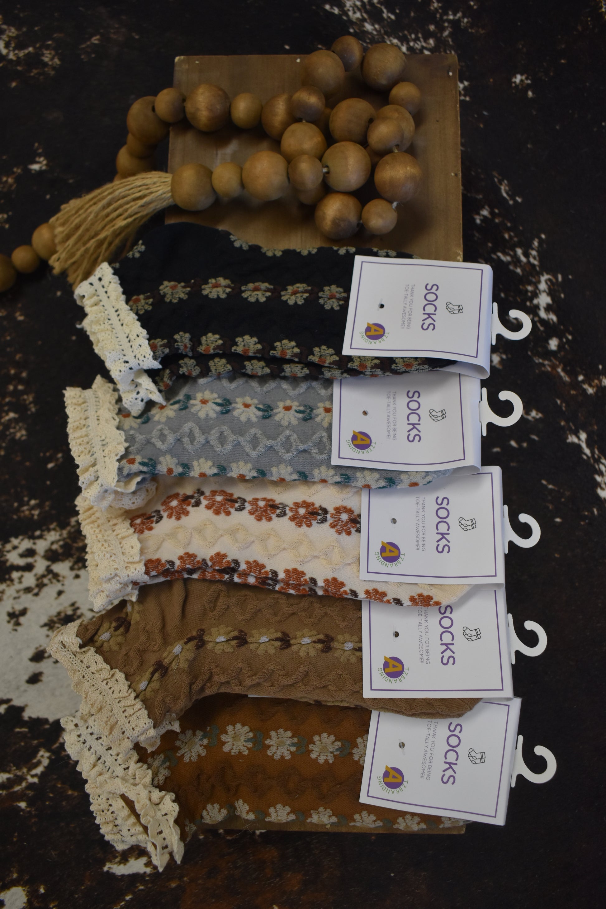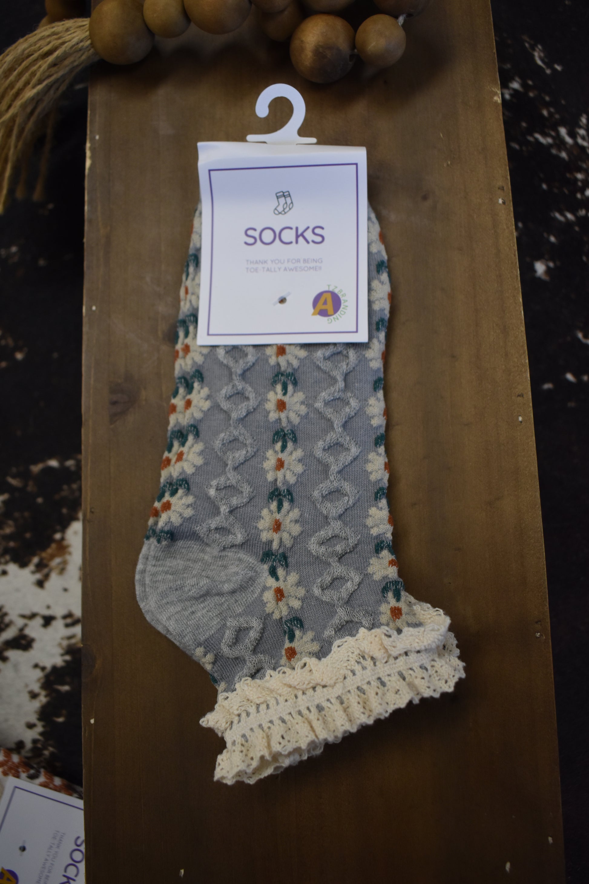 Adorable crew socks with floral pattern & lace trim. Lightweight and breathable!