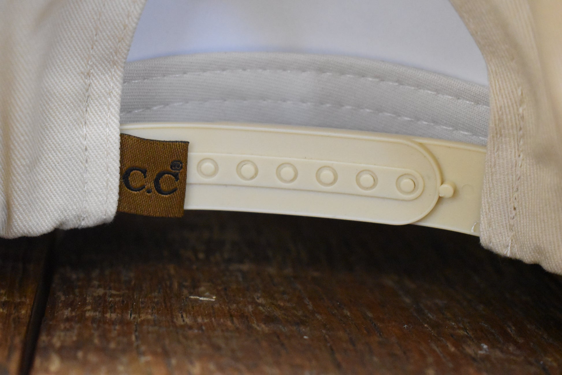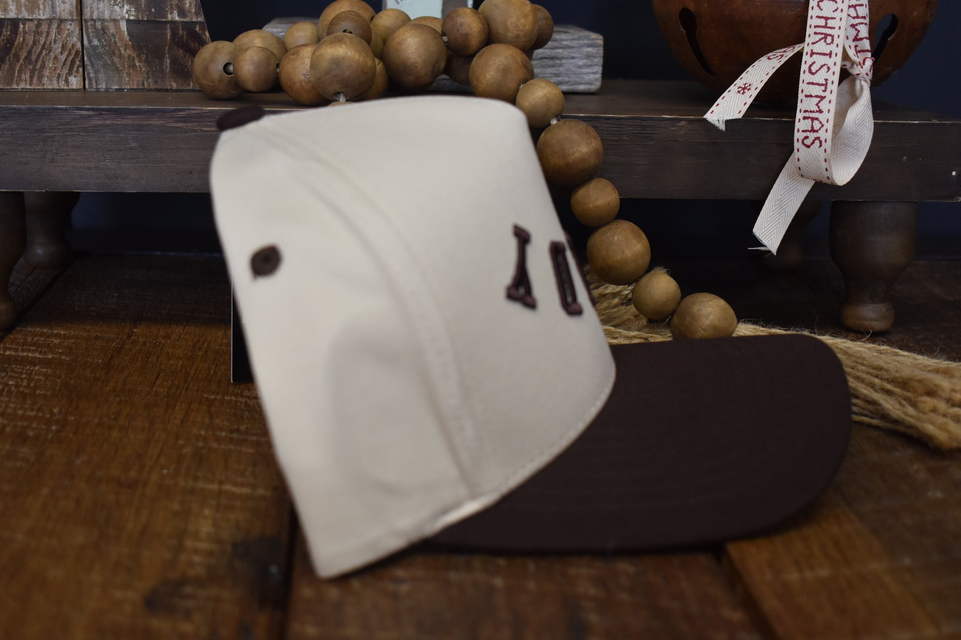 Two toned (cream & brown) trucker hat with brown, upside down embroidered detailing. Snapback for adjustable fit.