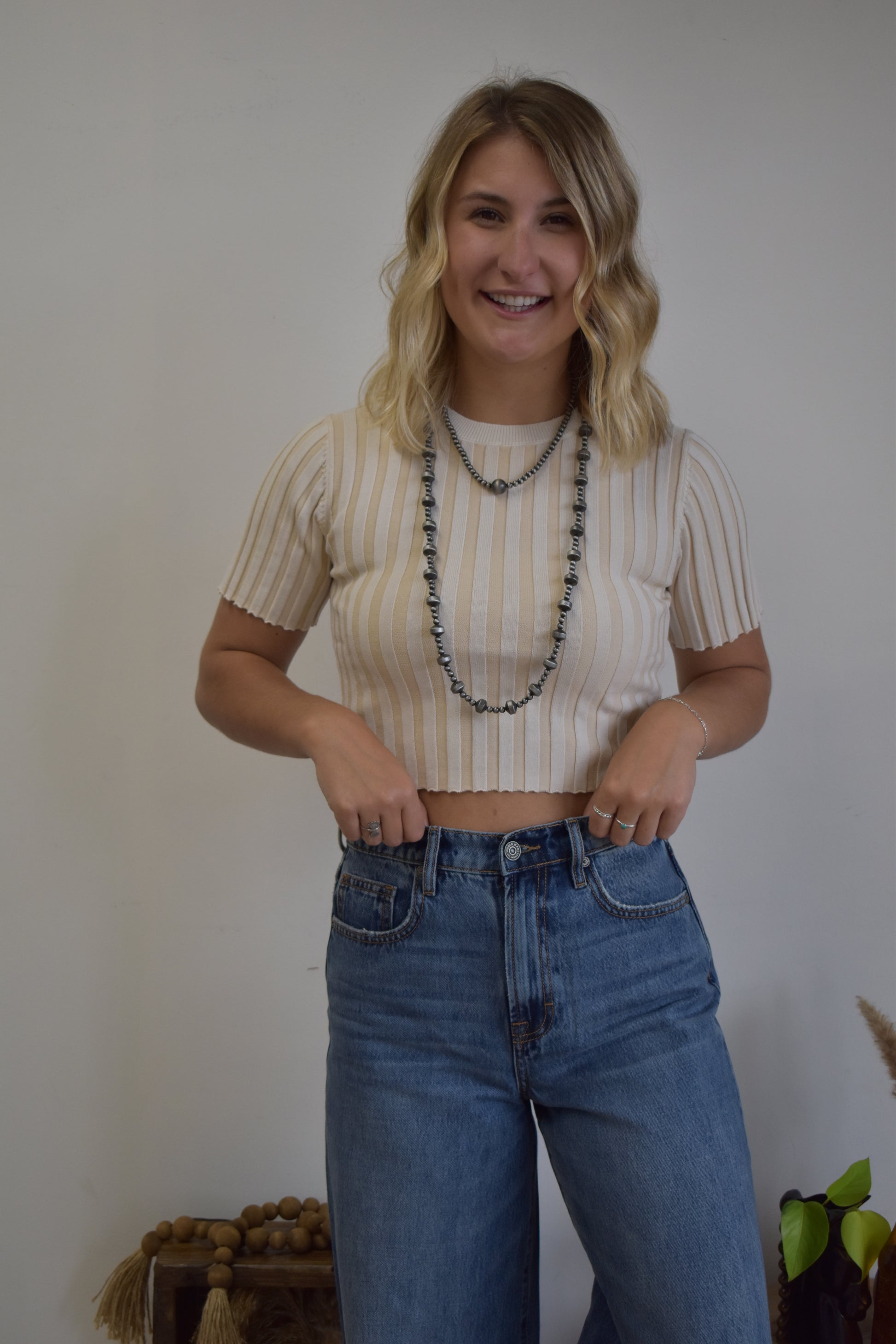 Ivory knit striped short sleeve, cropped with raw hem edges