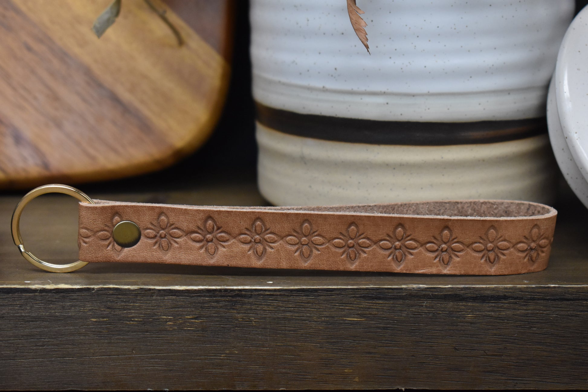 Stamped leather wristlet keychain with gold hardware.