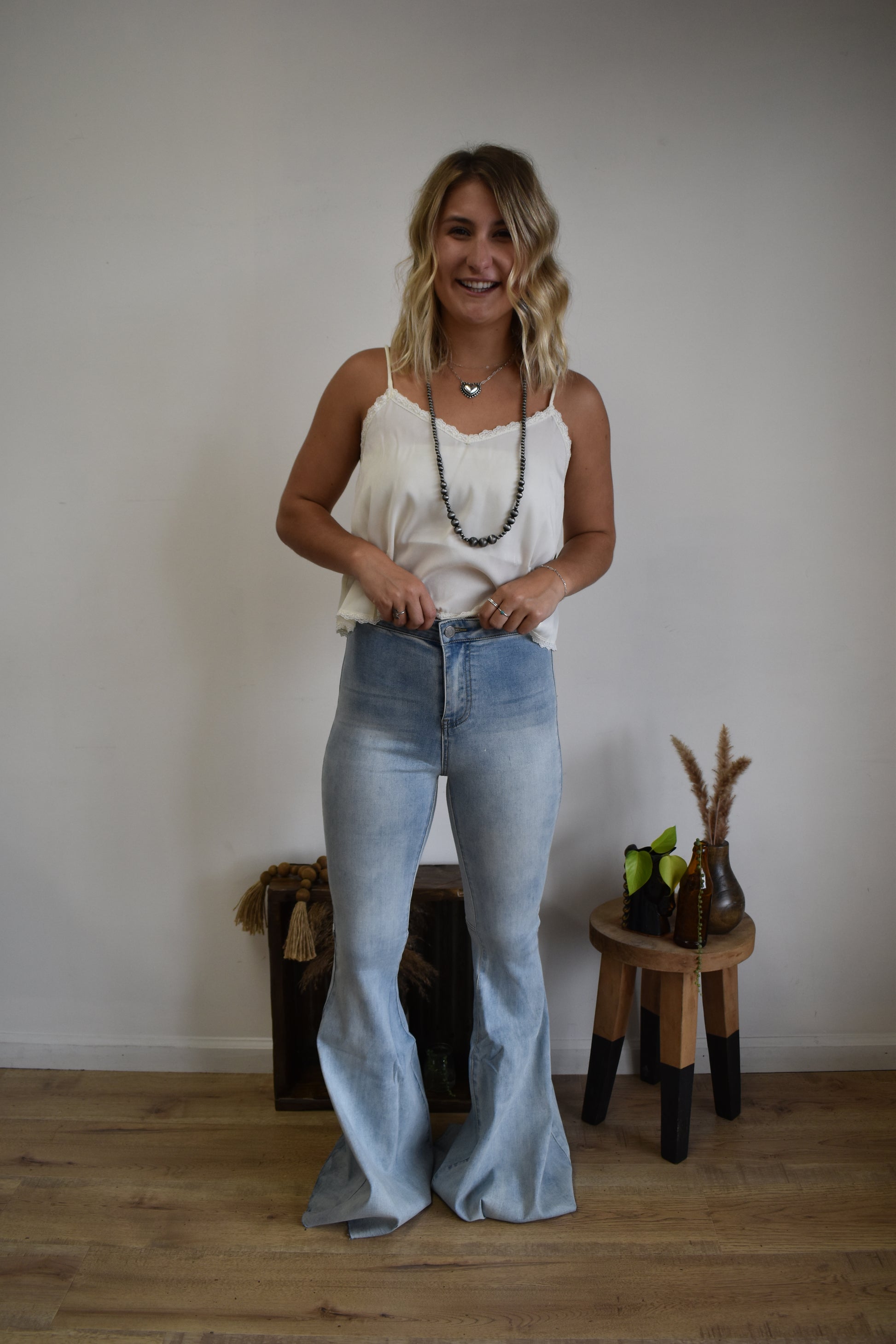 Super flared ultra high rise denim jeans with stitchd detailing on the back above pockets and back of knee. No belt loops, thin soft jeans.