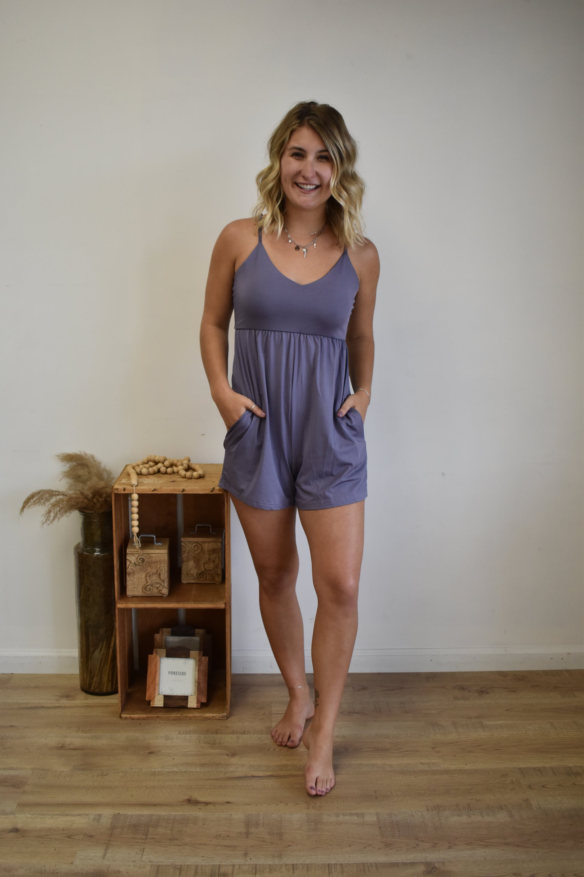Loose tennis camisole romper, soft v-neck line with adjustable straps and two side pockets.