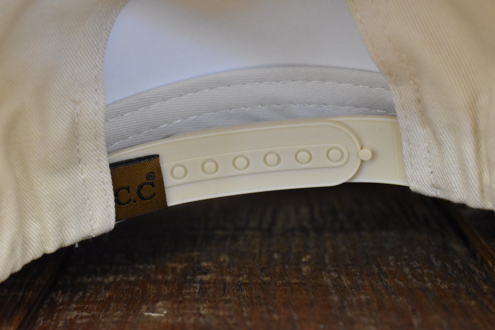 Two toned (cream & black) trucker hat with red embroidered detailing. Snapback for adjustable fit.