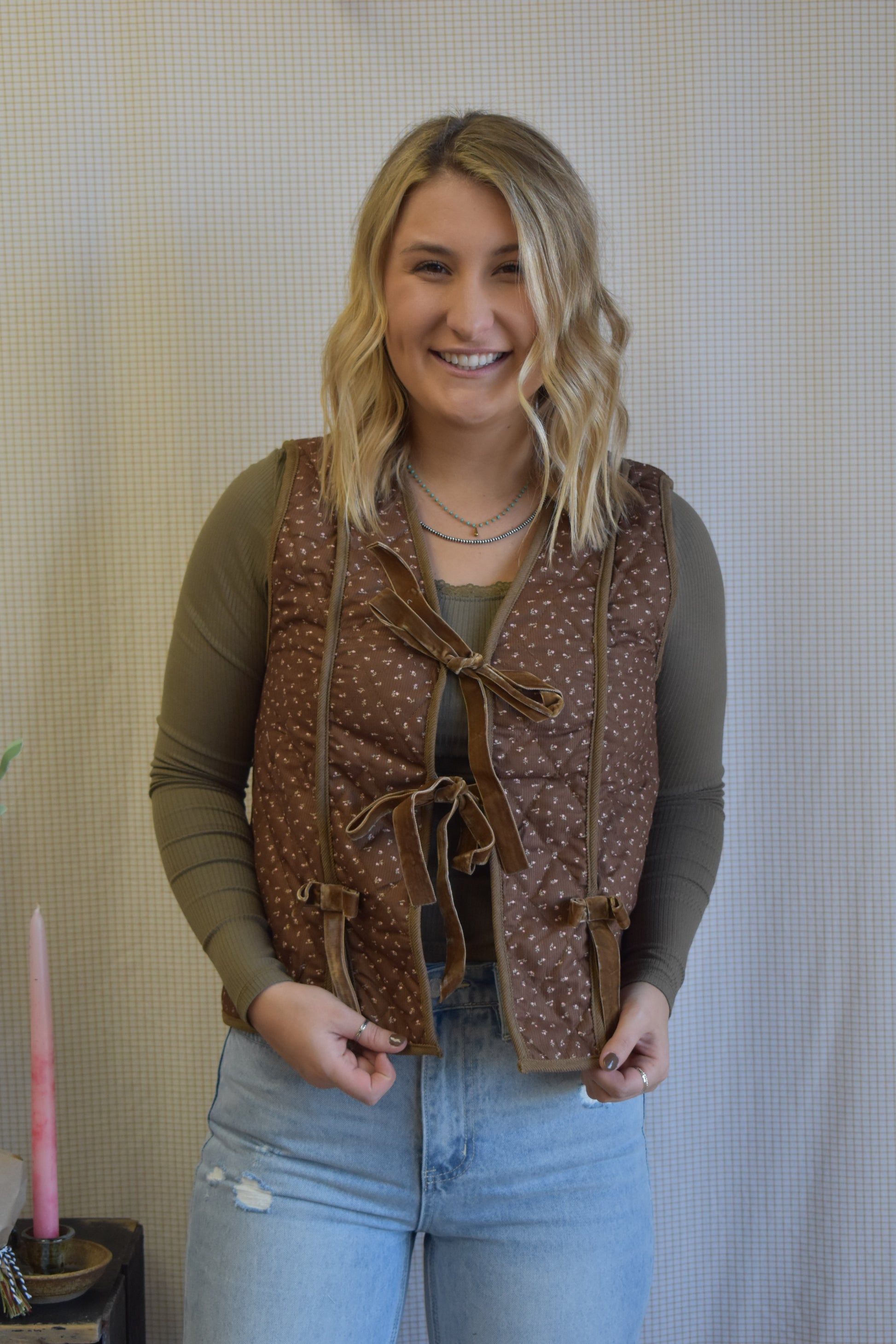 Quilted dark brown vest with two tie front closures, 2 hip bows with slit, & sewn cording detail ran down both front panels. Extremely soft inside.