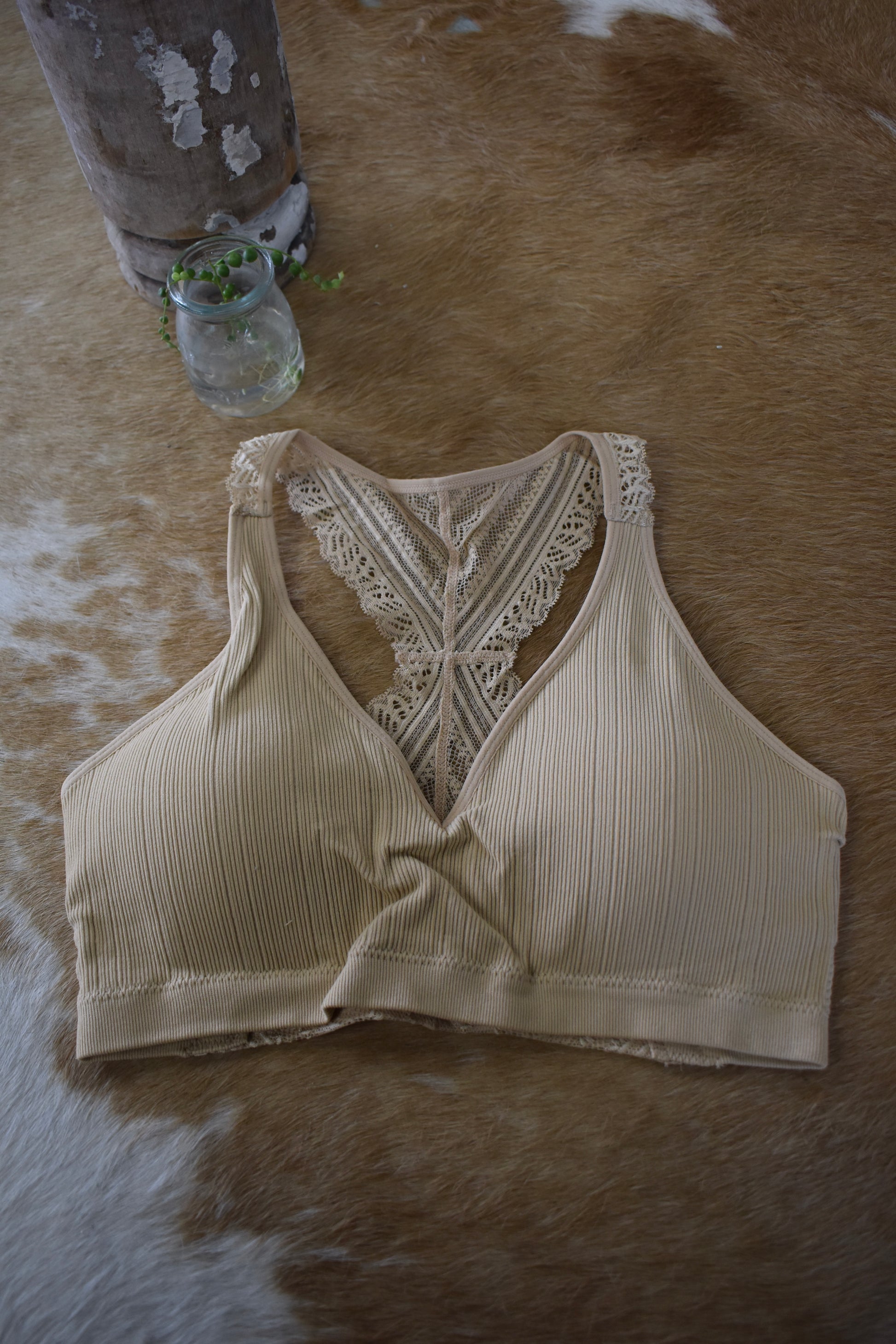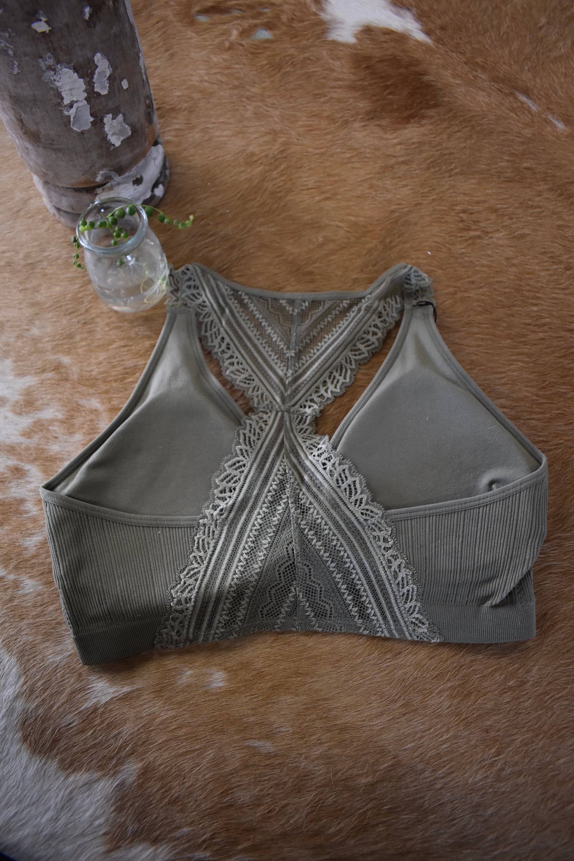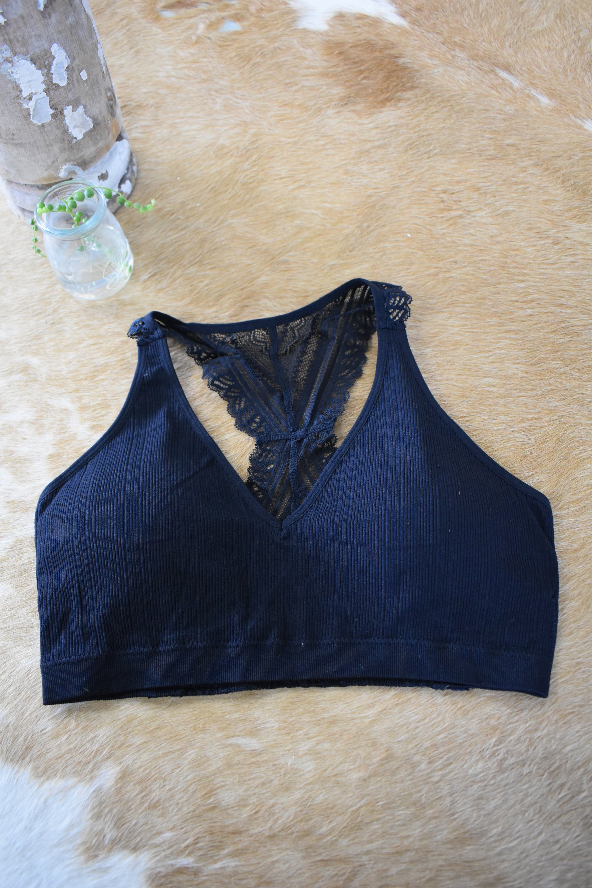 Racer back padded bralette, soft comfy lace, hidden seams, removable thin pads.