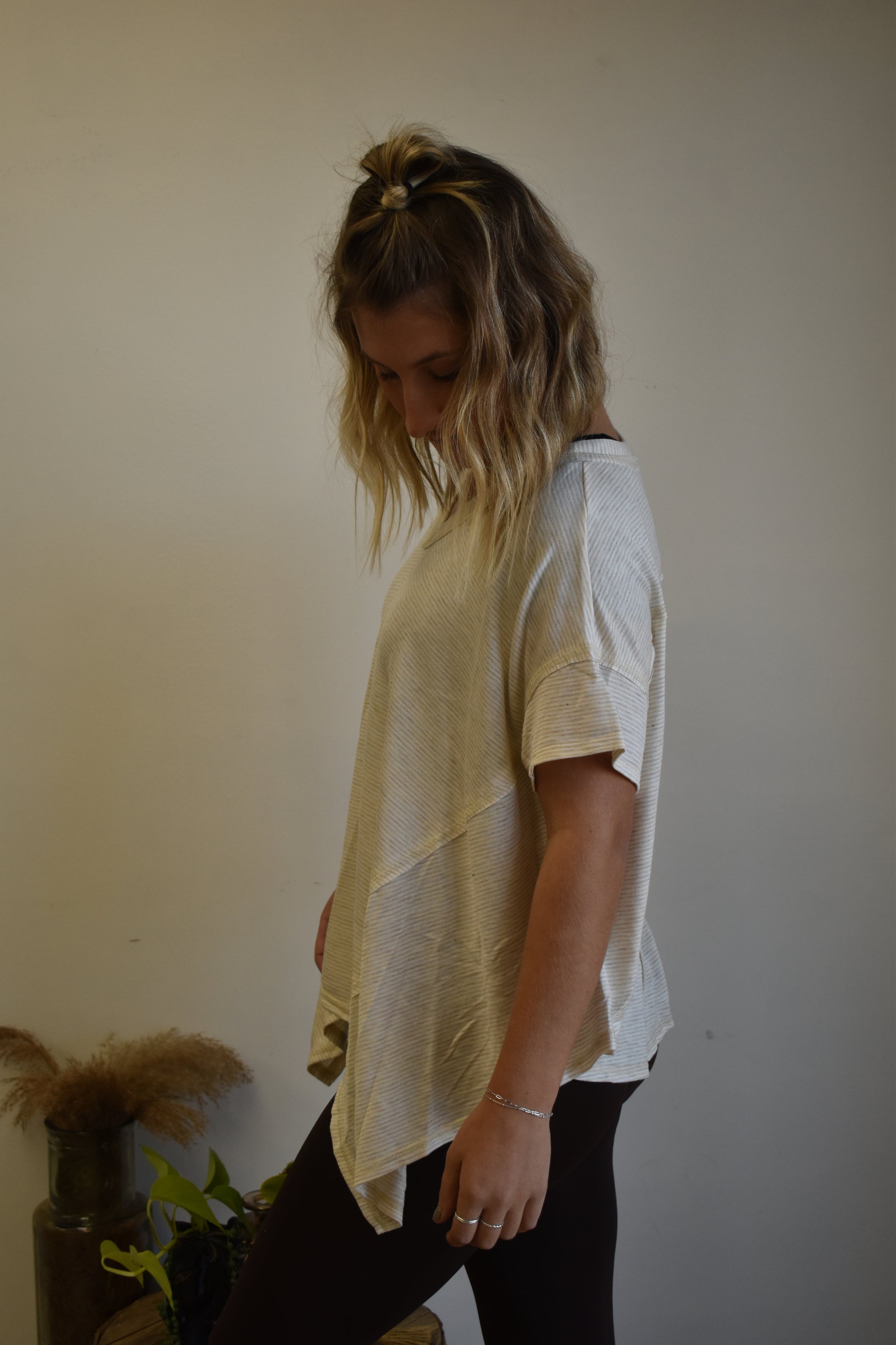 Oatmeal colored, short sleeve, oversized top. High-low hem with v-neck. Contrast horizontal stripes.