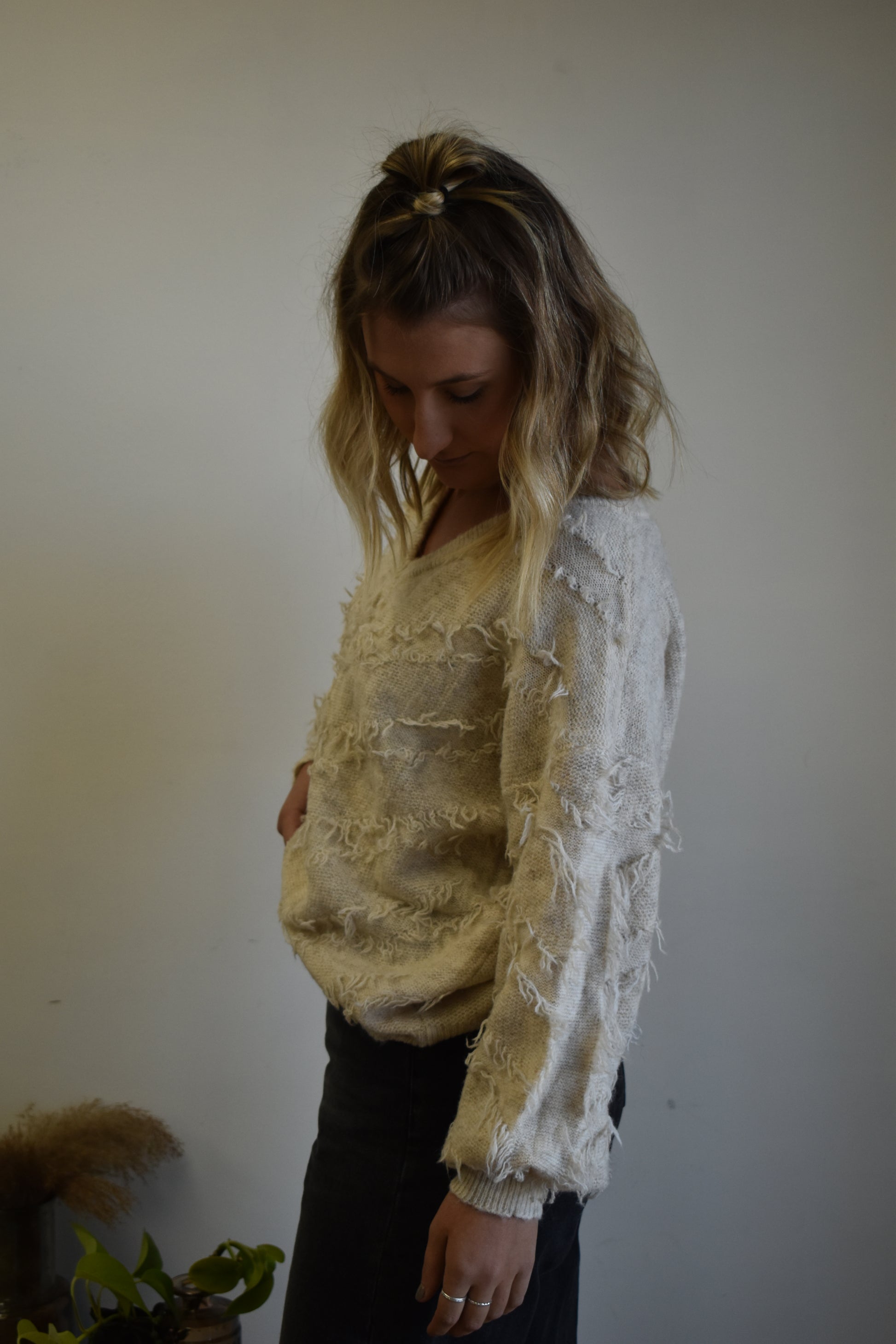 Oatmeal colored sweater with v-neckline and adorable fringe detailing.