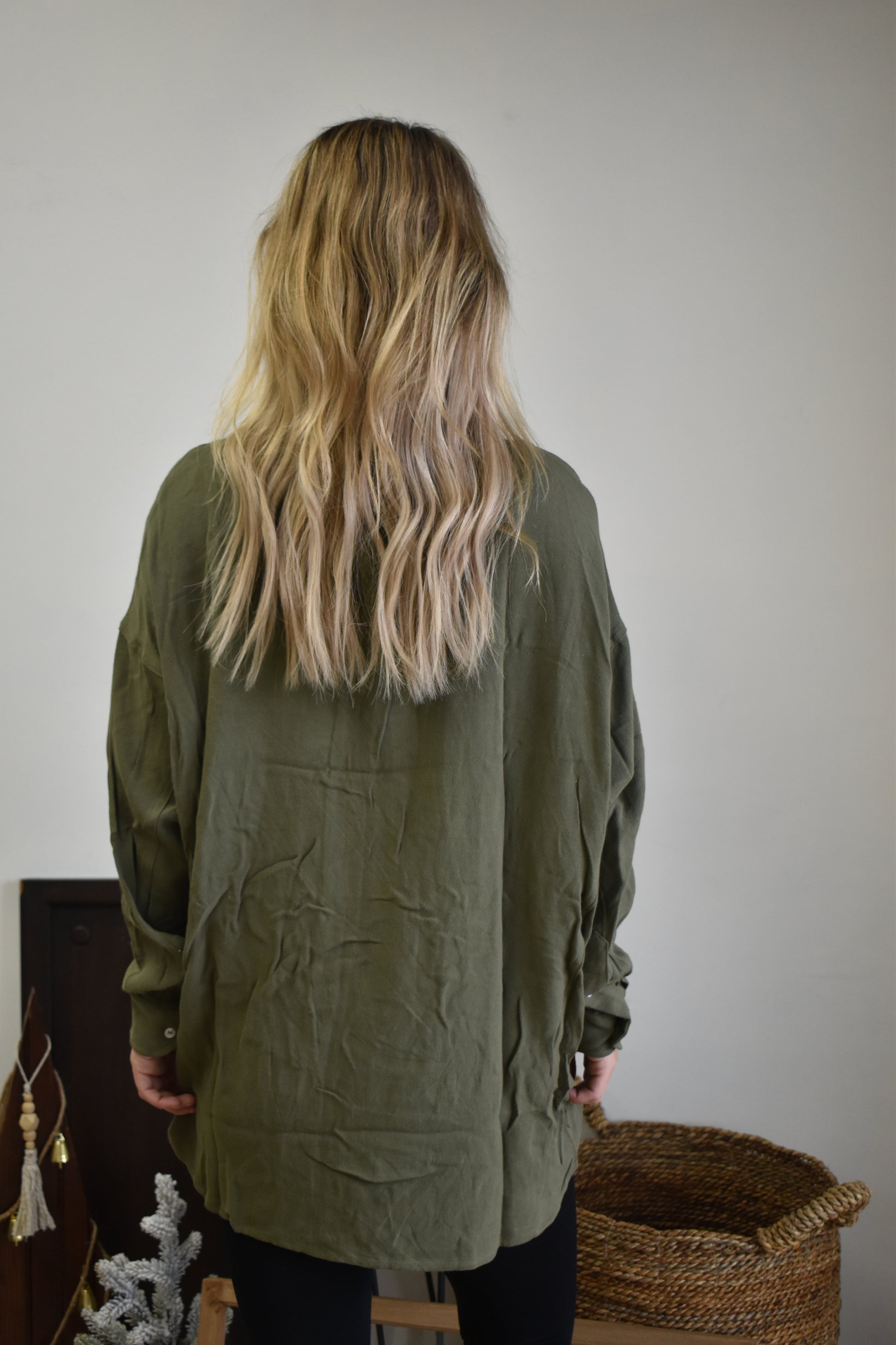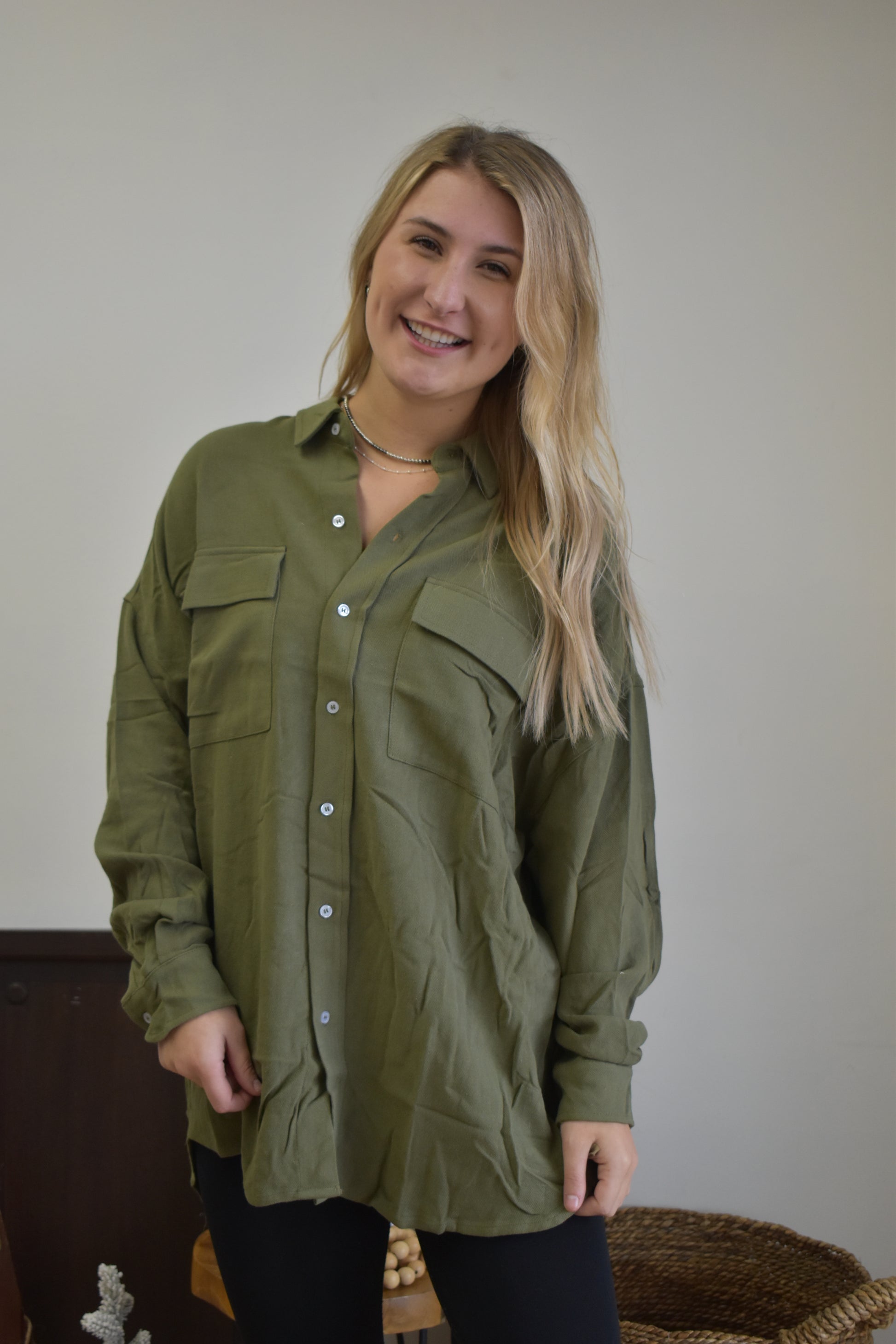 Button up long sleeve with functional front pockets. Collared neckline and cuff sleeves.