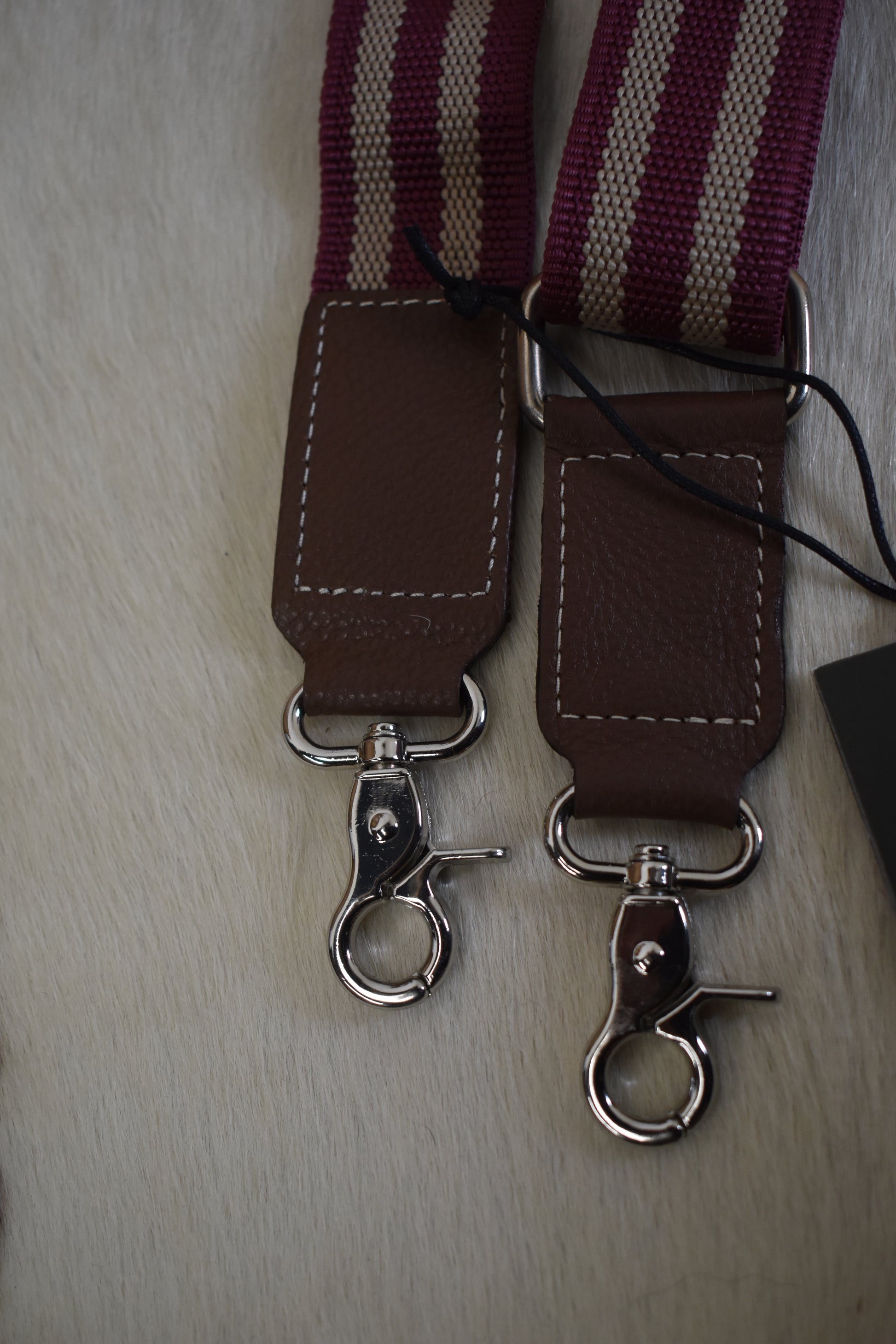 Adjustable bag strap with silver hardware and brown leather detailing.
