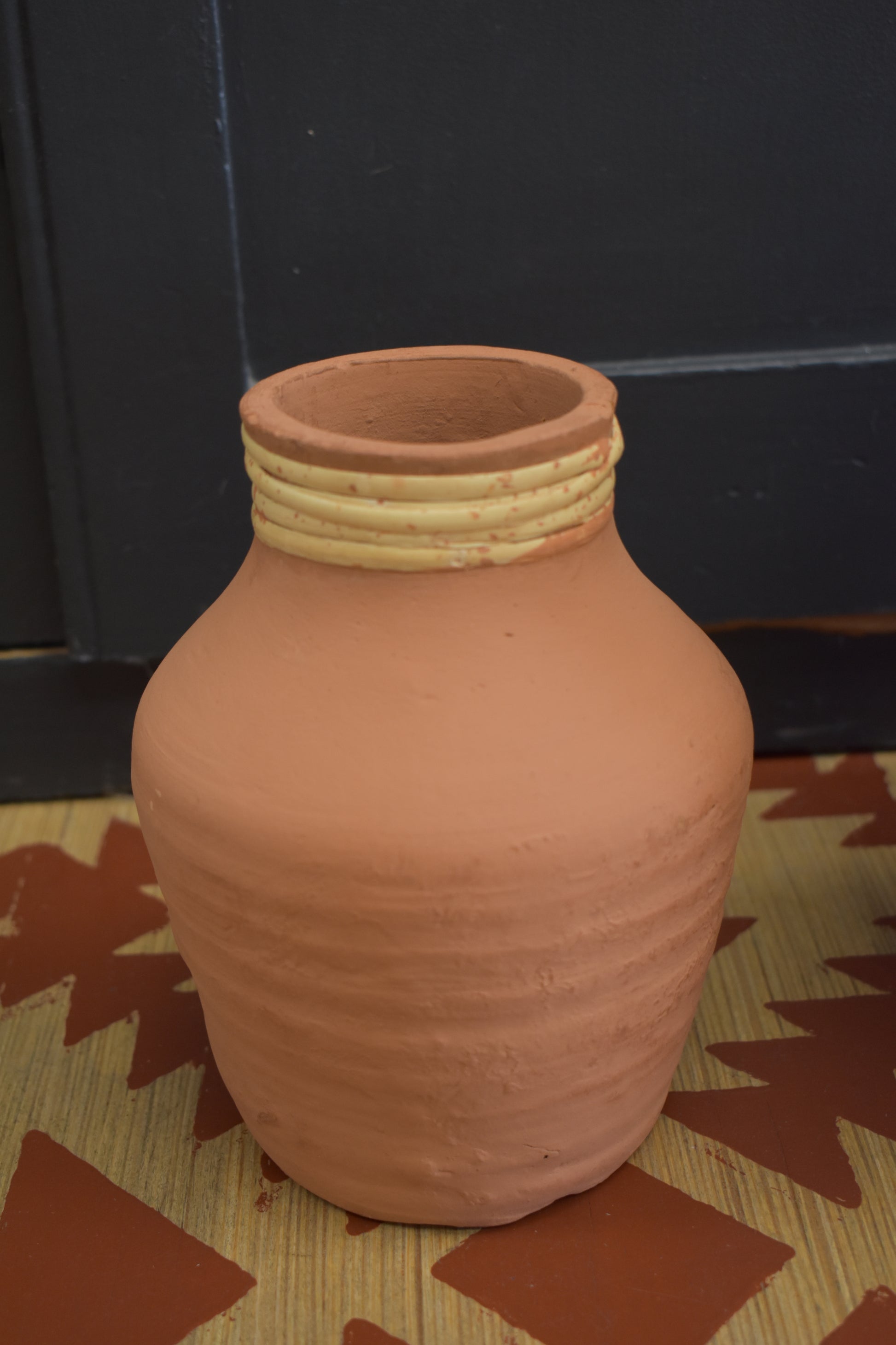 This hand thrown vase made of natural terracotta clay is accented with an intricate rattan wrap around the rim that is all done by hand. This vase easily transitions from season to season and is great for boho or rustic decor styles. The neutral color is great for dried stems, arrangements or as a standalone accent. -Vessel is not watertight; suitable for dried bouquets and faux stems -Crafted from terracotta that is hand thrown and hand painted by artisans in India. Due to the handcrafted nature of this item, no two pieces will be identical. -Great for stems or leave empty as a decorative vessel. -Material: Terracotta & Rattan -Mouth Diameter: 3" -Rich, bold terracotta color is softened by natural rattan wrapping. -Perfect For: Clearance, Sale, Boho Decor, Bohemian Decor, Natural Decor, Rustic Decor, Floral, Vase, Fall Vase Decor, Spring Flowers, Small Gifts, Home Gifts, Gift Shop Item, Dried Floral, Fake Flowers, India handicrafts, Rattan, Pottery Handmade