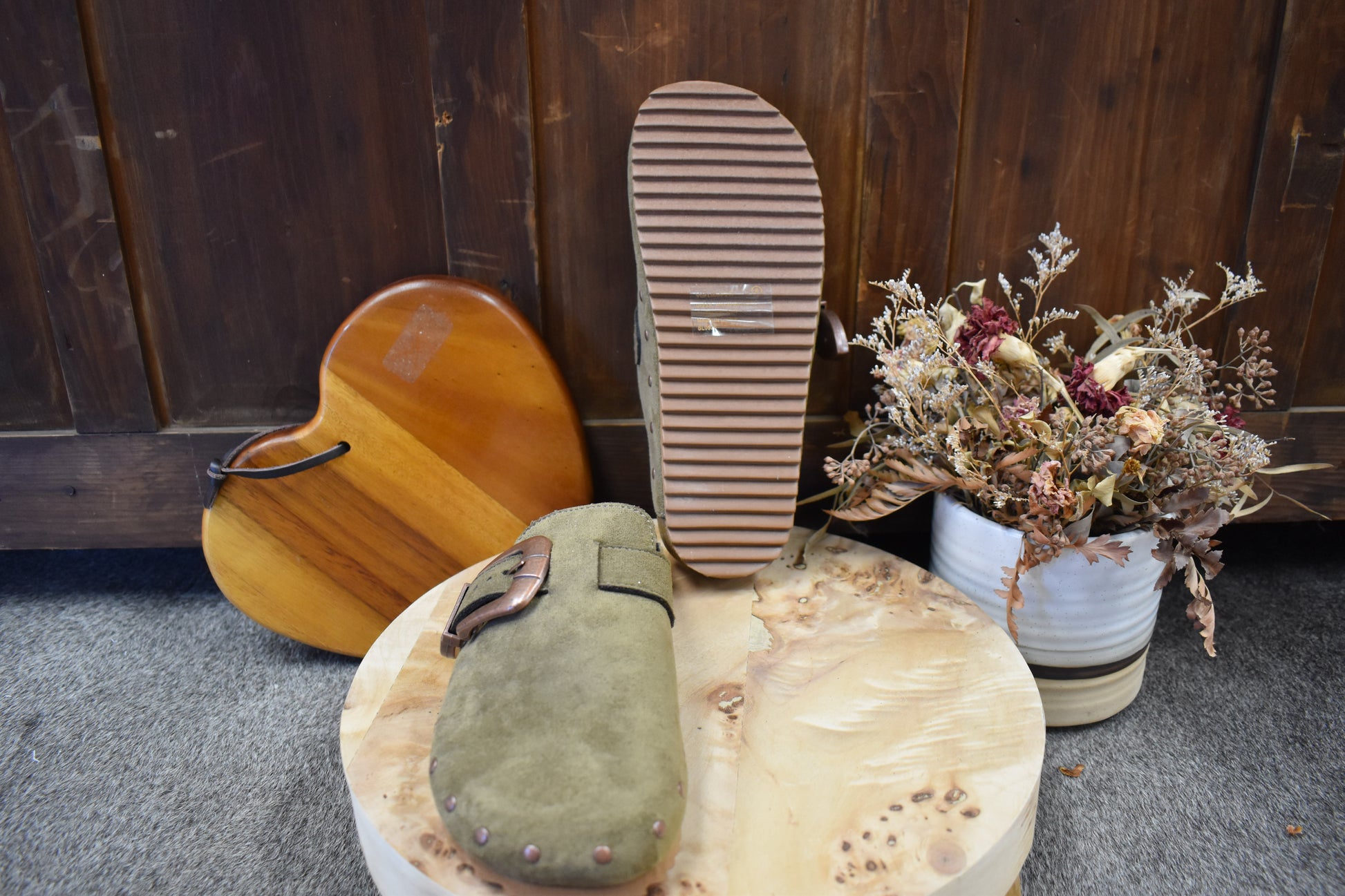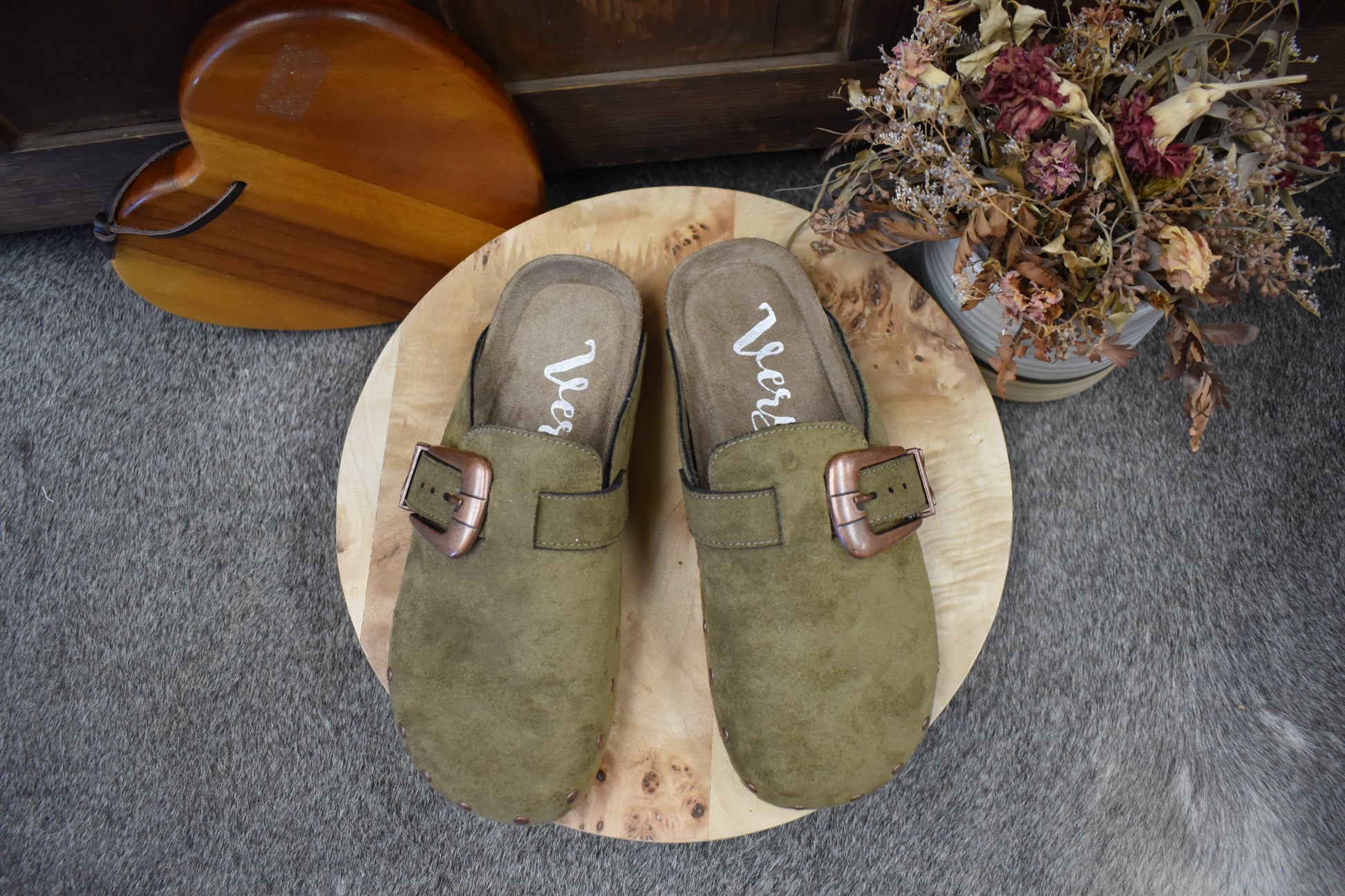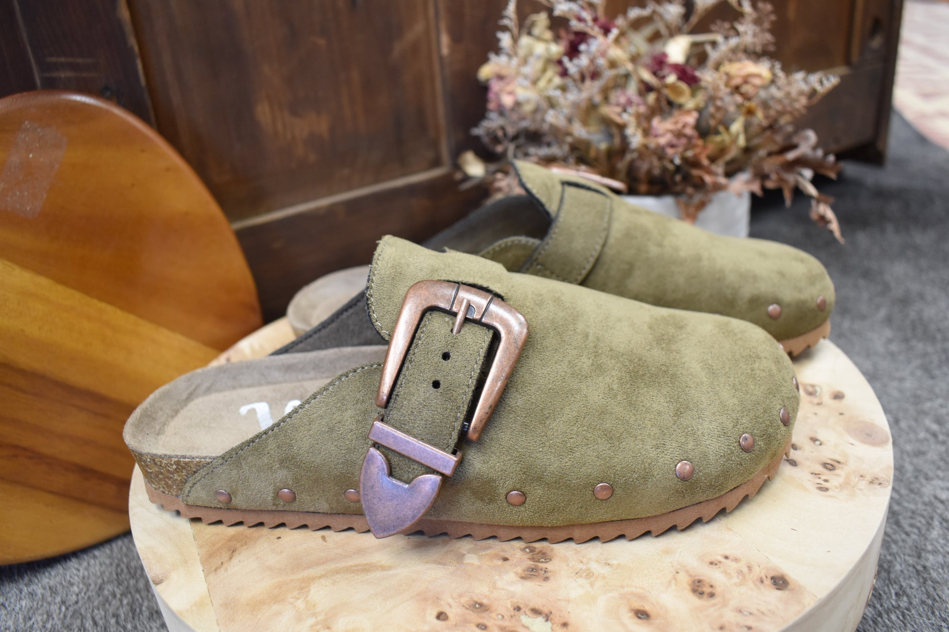 Olive studded mule with rose gold adjustable buckle. Soft arch support sole. Elastic buckle attached.