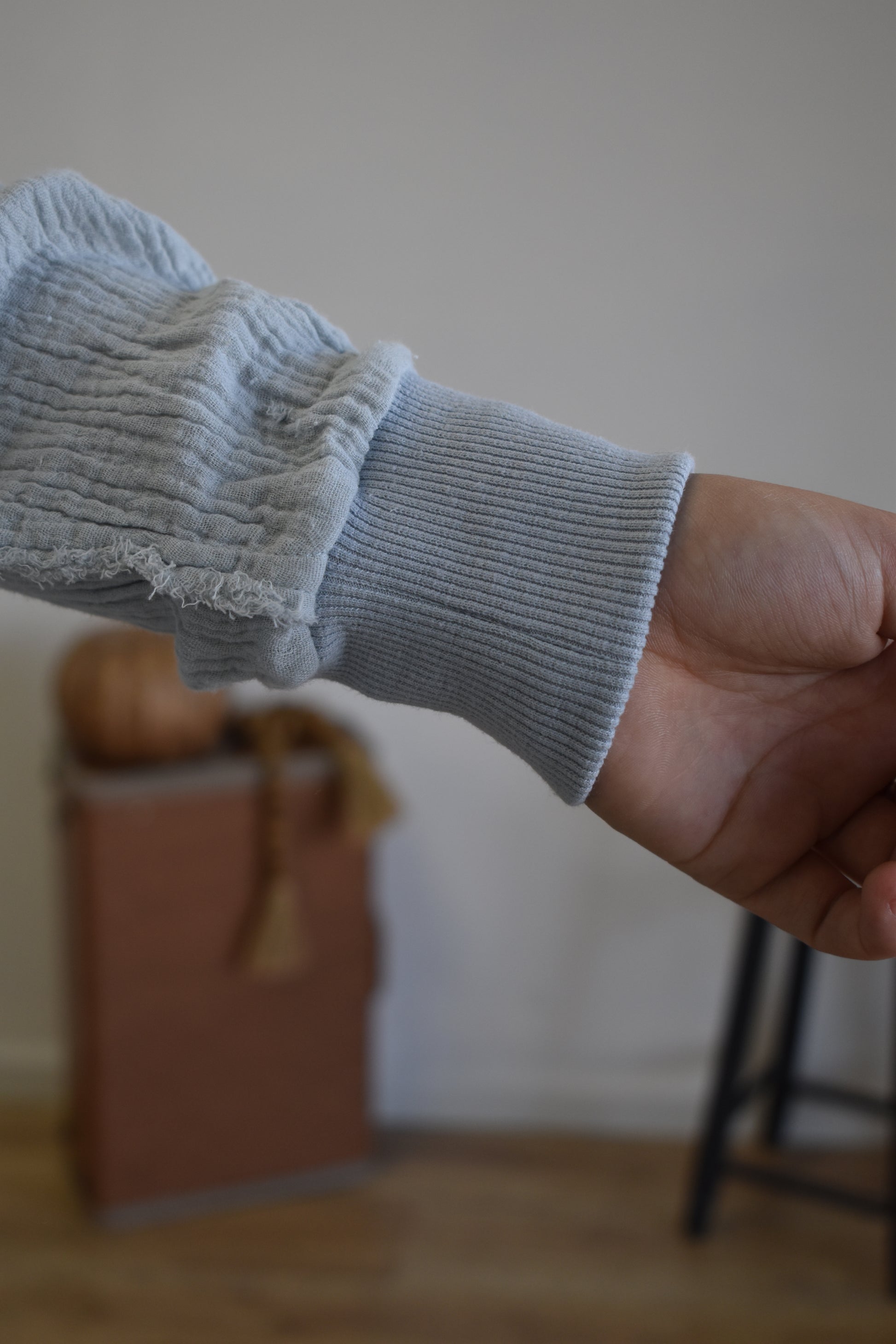 Gauze raw hem blouse with button chest closure half way, long elastic sleeves +front left chest pocket.