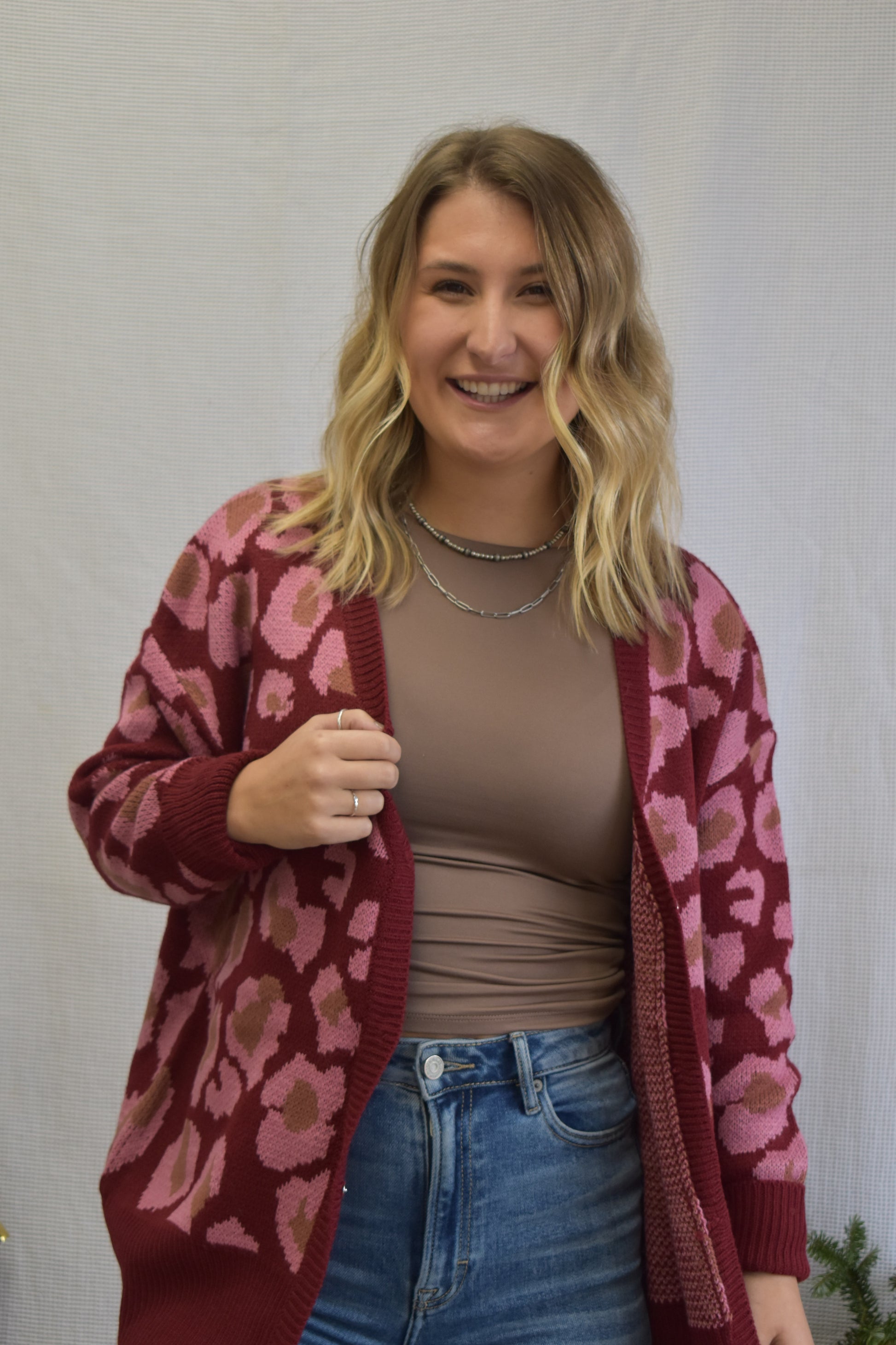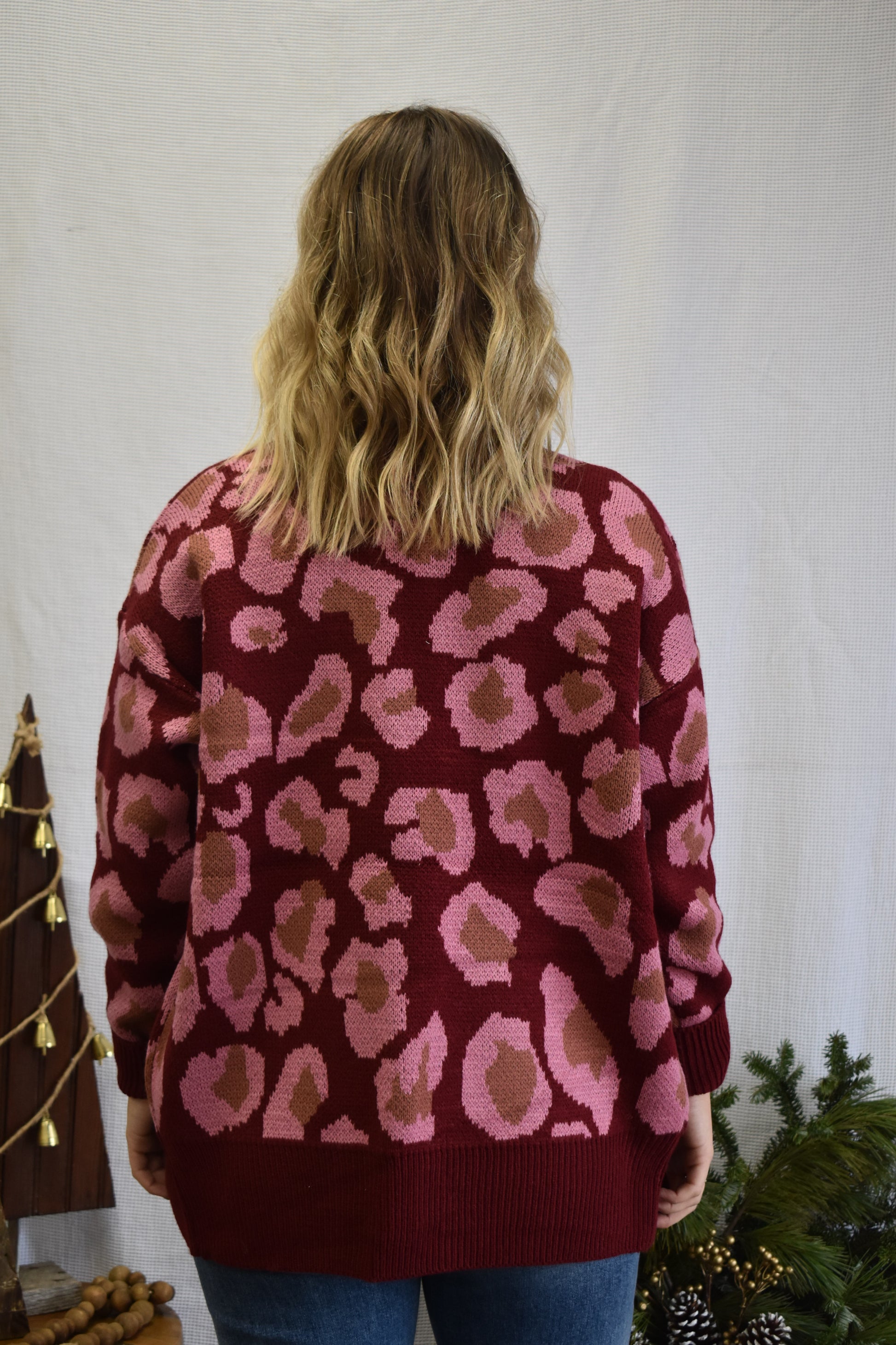 Burgundy long sleeve sweater with pink leopard detailing. Deep v-neckline and quarter length button down.