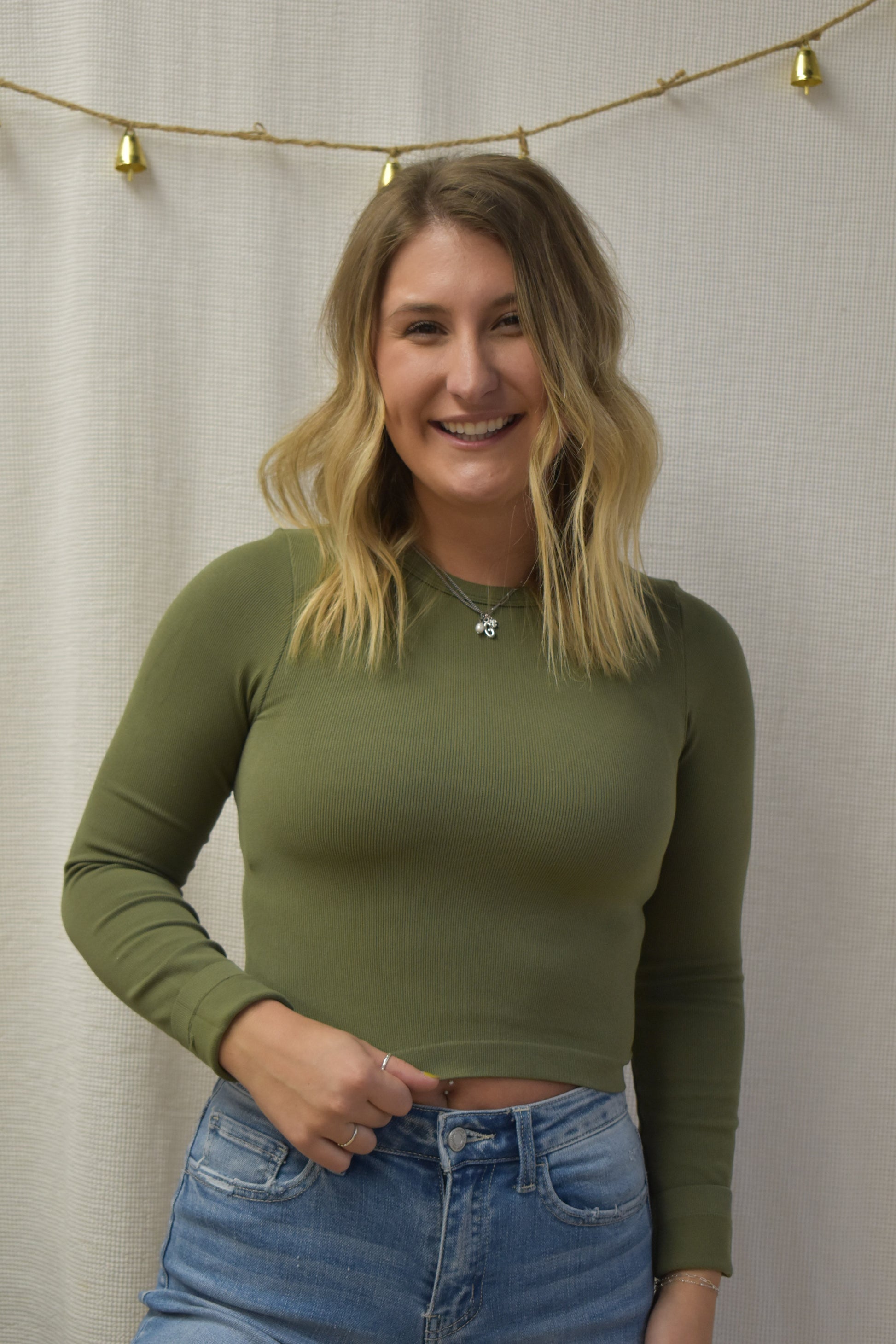Ribbed, seamless, cropped long sleeve with round neckline.