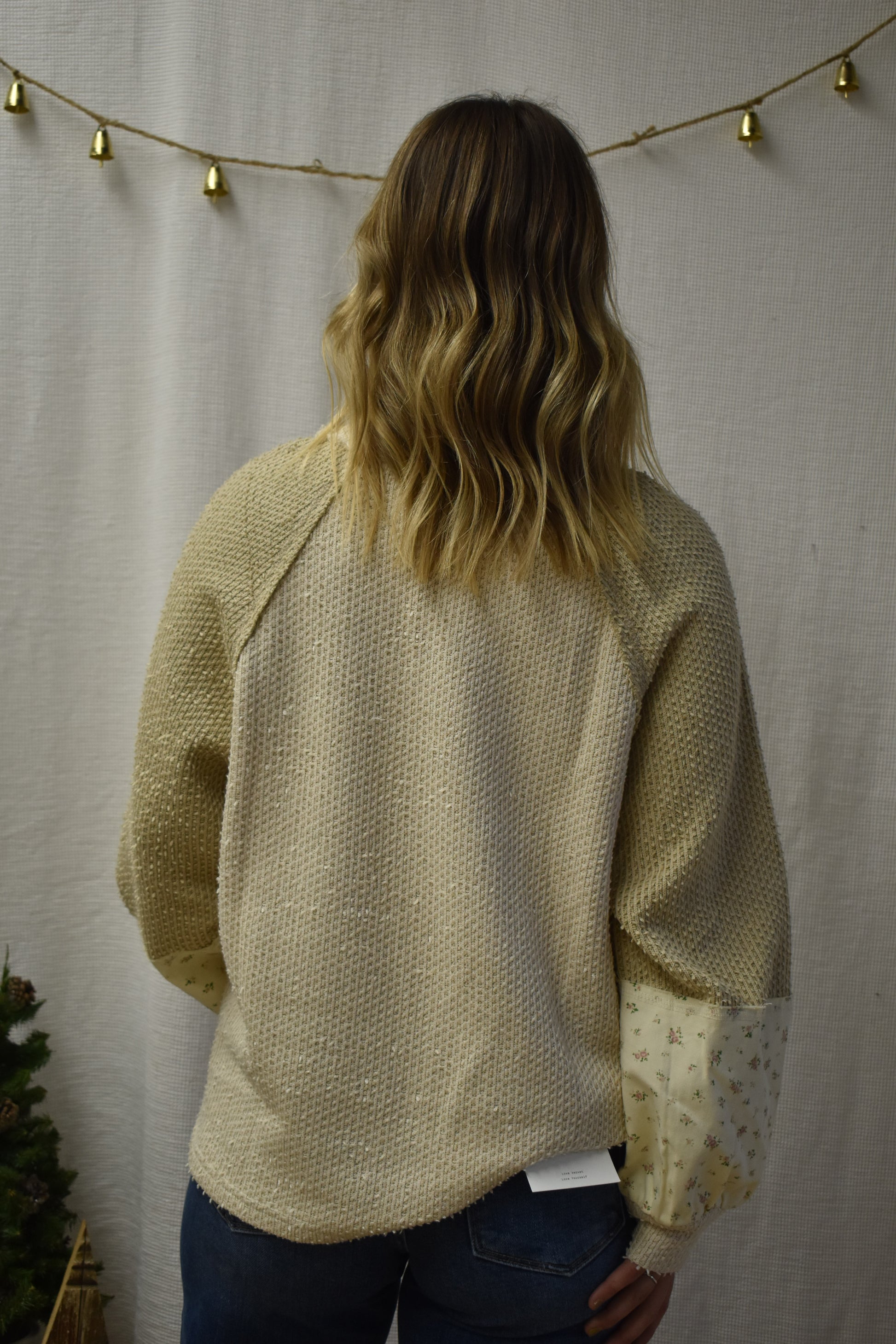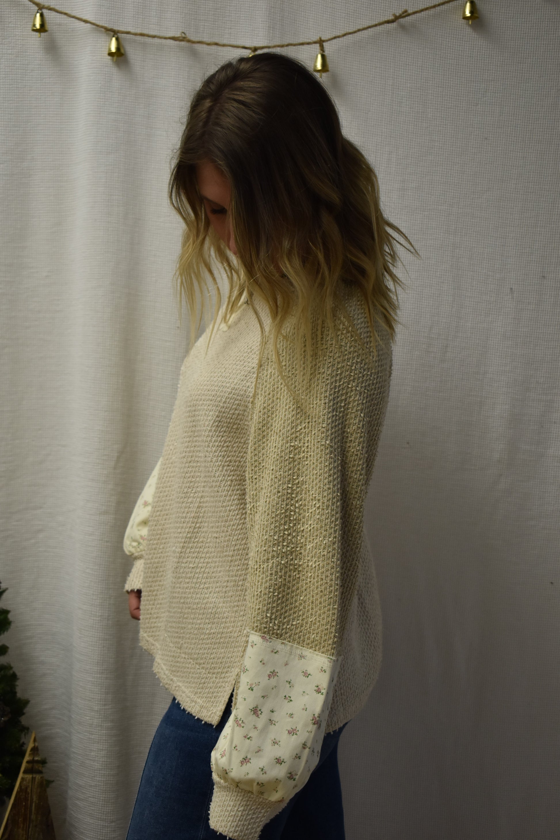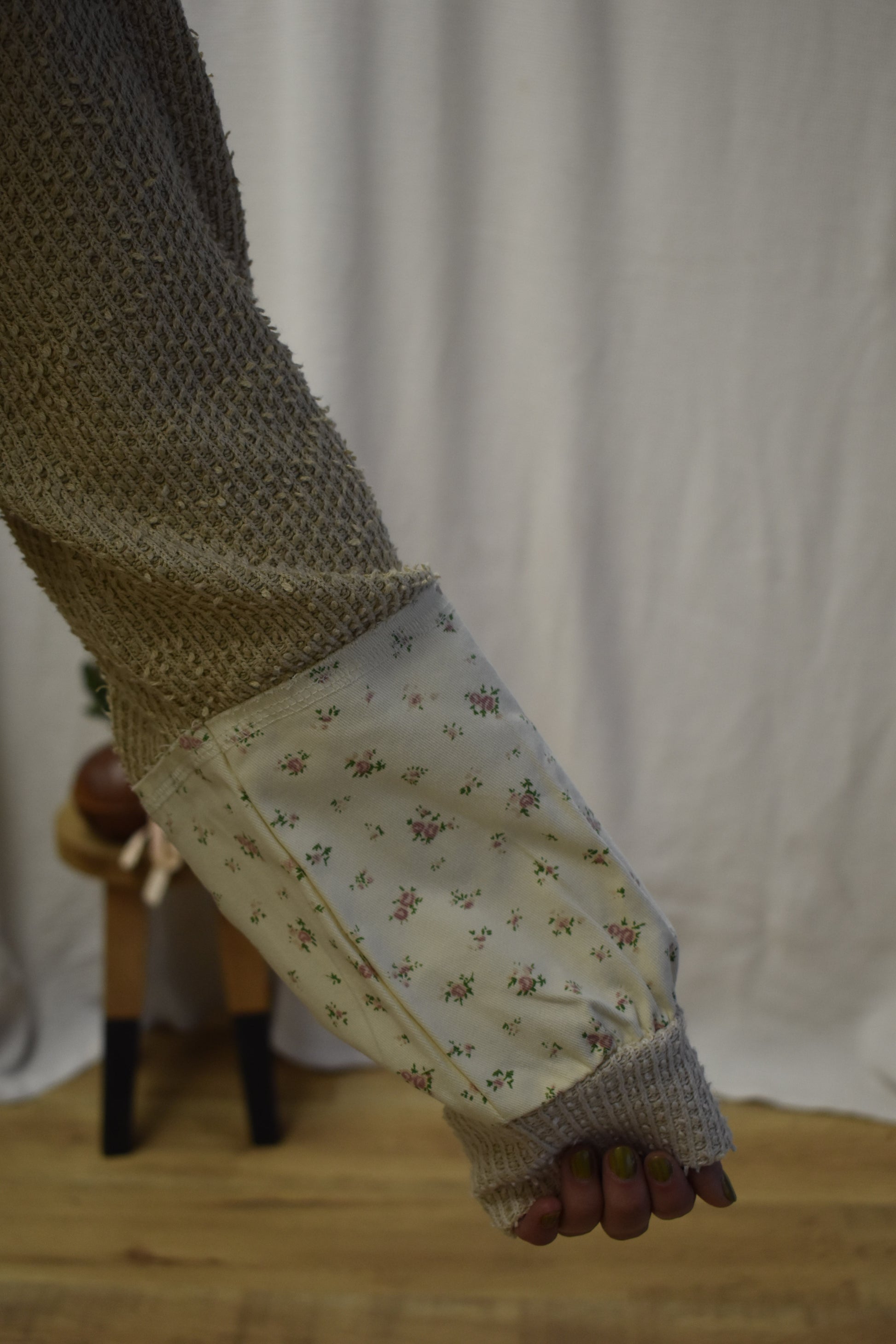 Long sleeve, color block textured knit top. Adorable floral detailing on sleeve & neckline.
