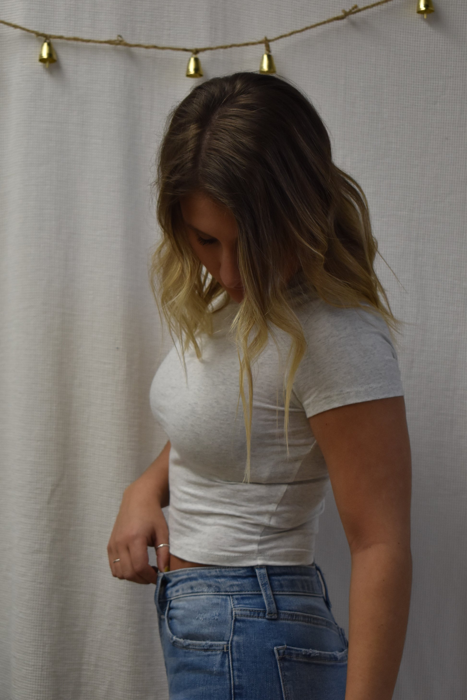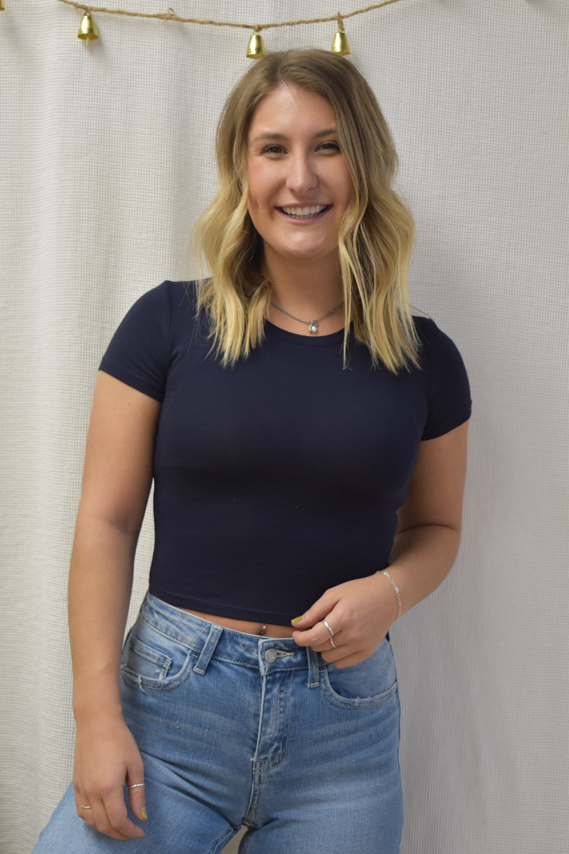 Short sleeve cropped top with round neckline. Perfect for layering!