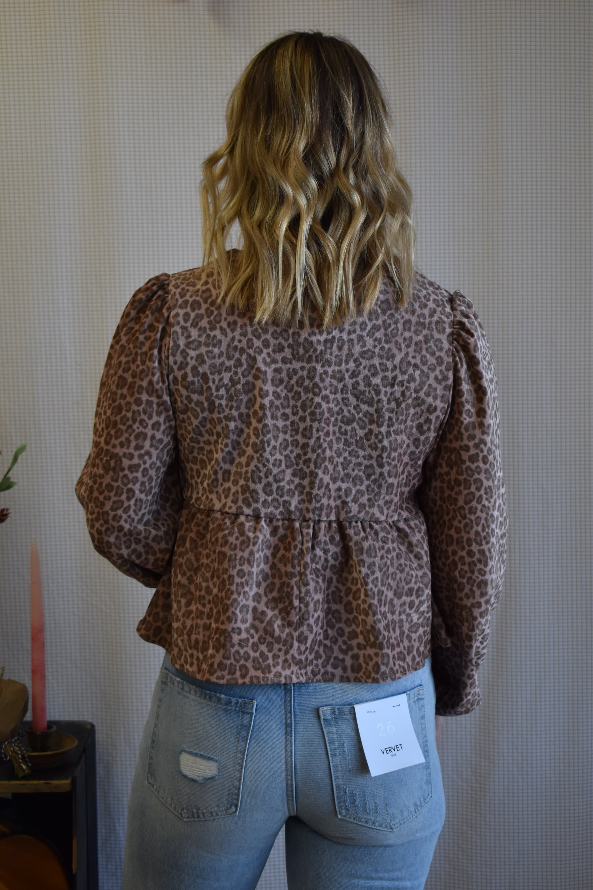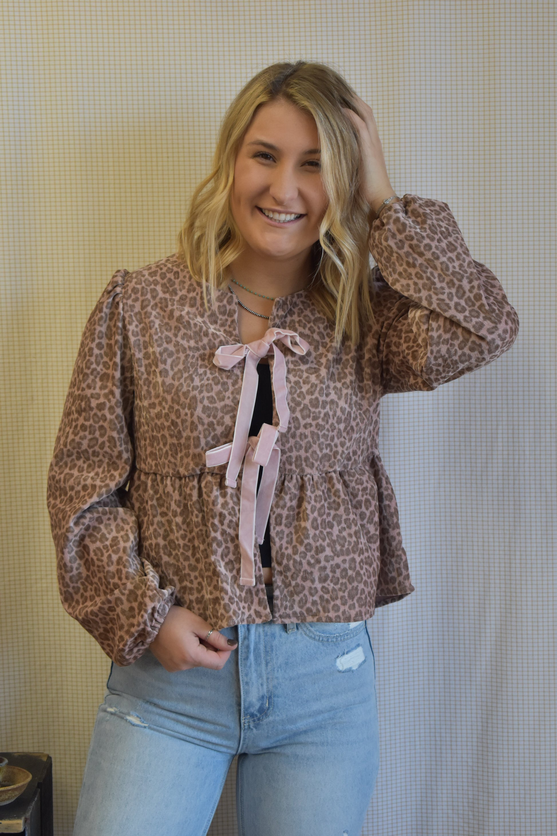 Leopard print, velvet textured, long sleeve top with velvet front ties. Peplum detailing & cinched wrist hems.