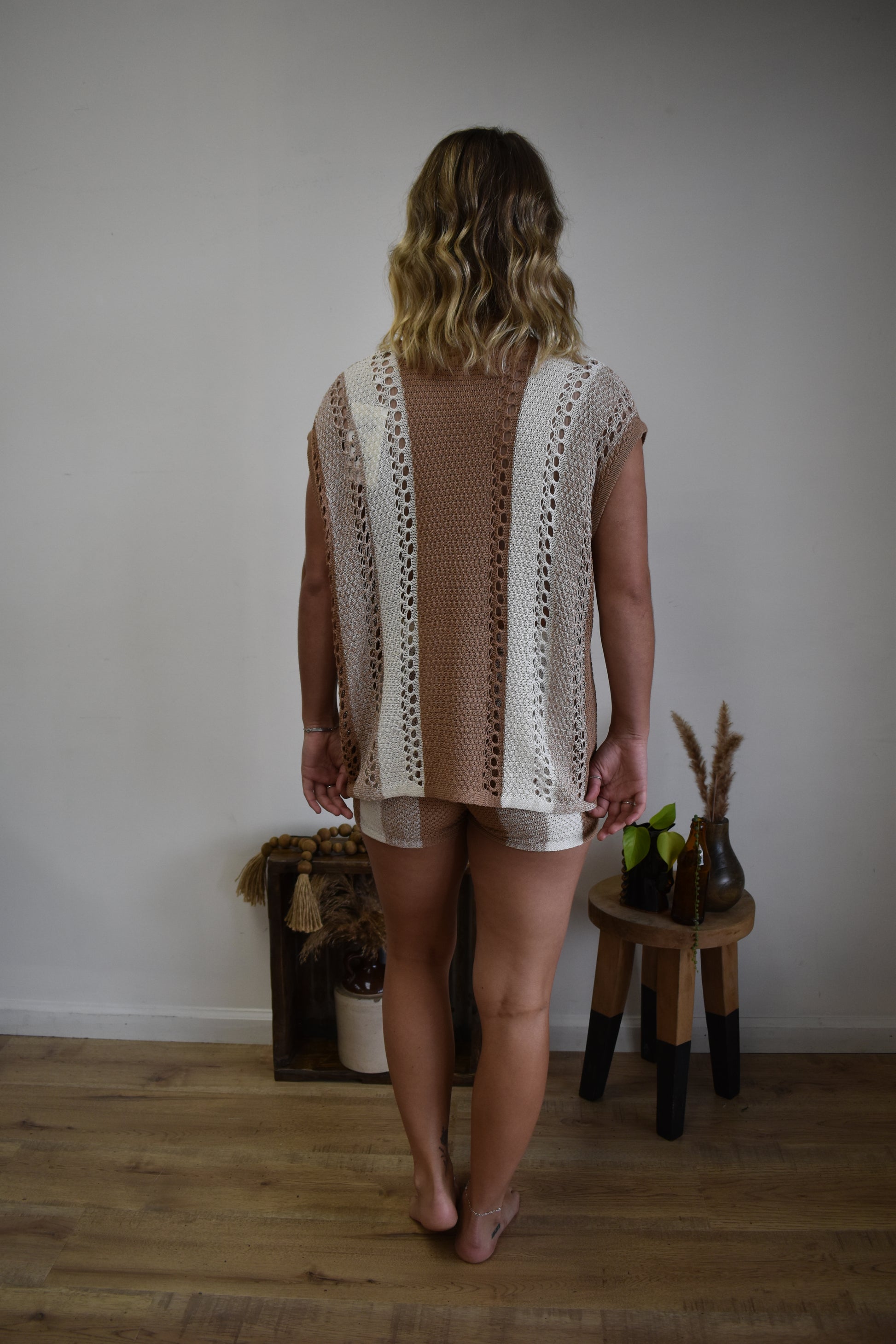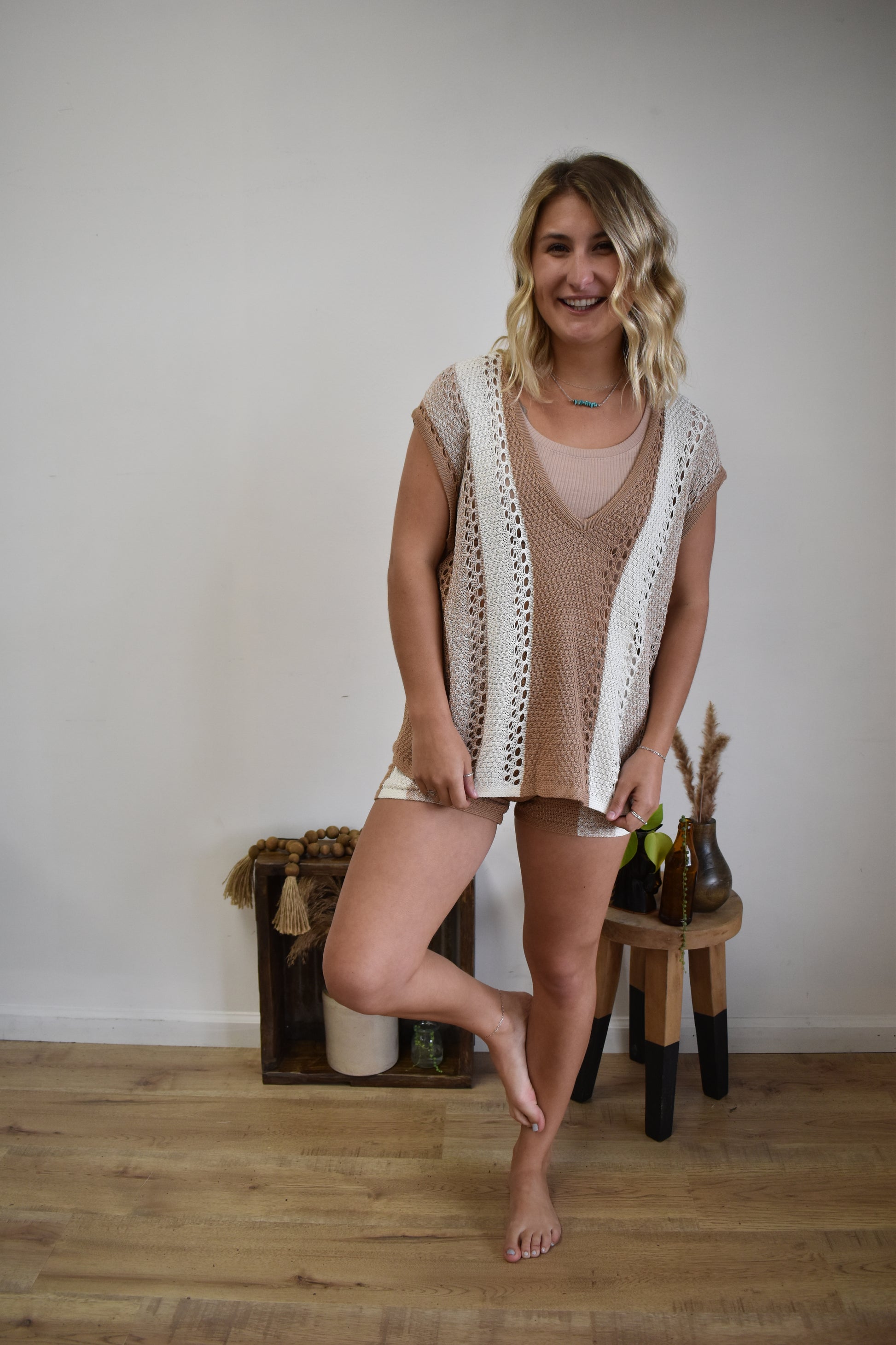 Two piece crochet set with casual shorts and v-neck tank.