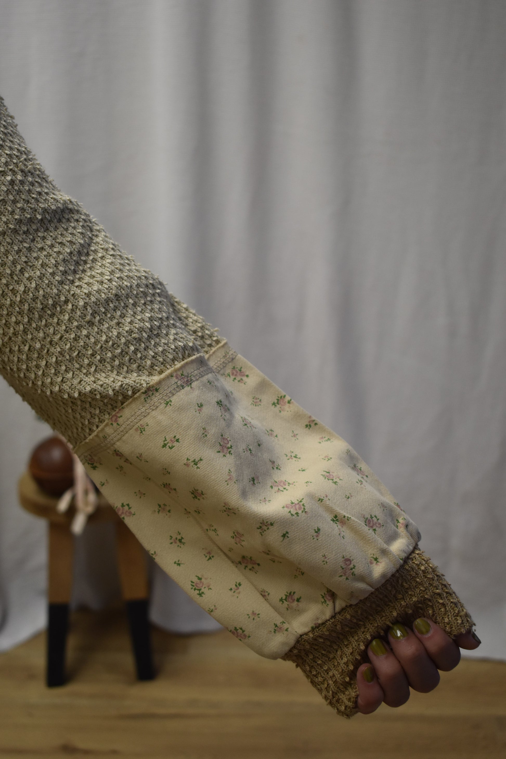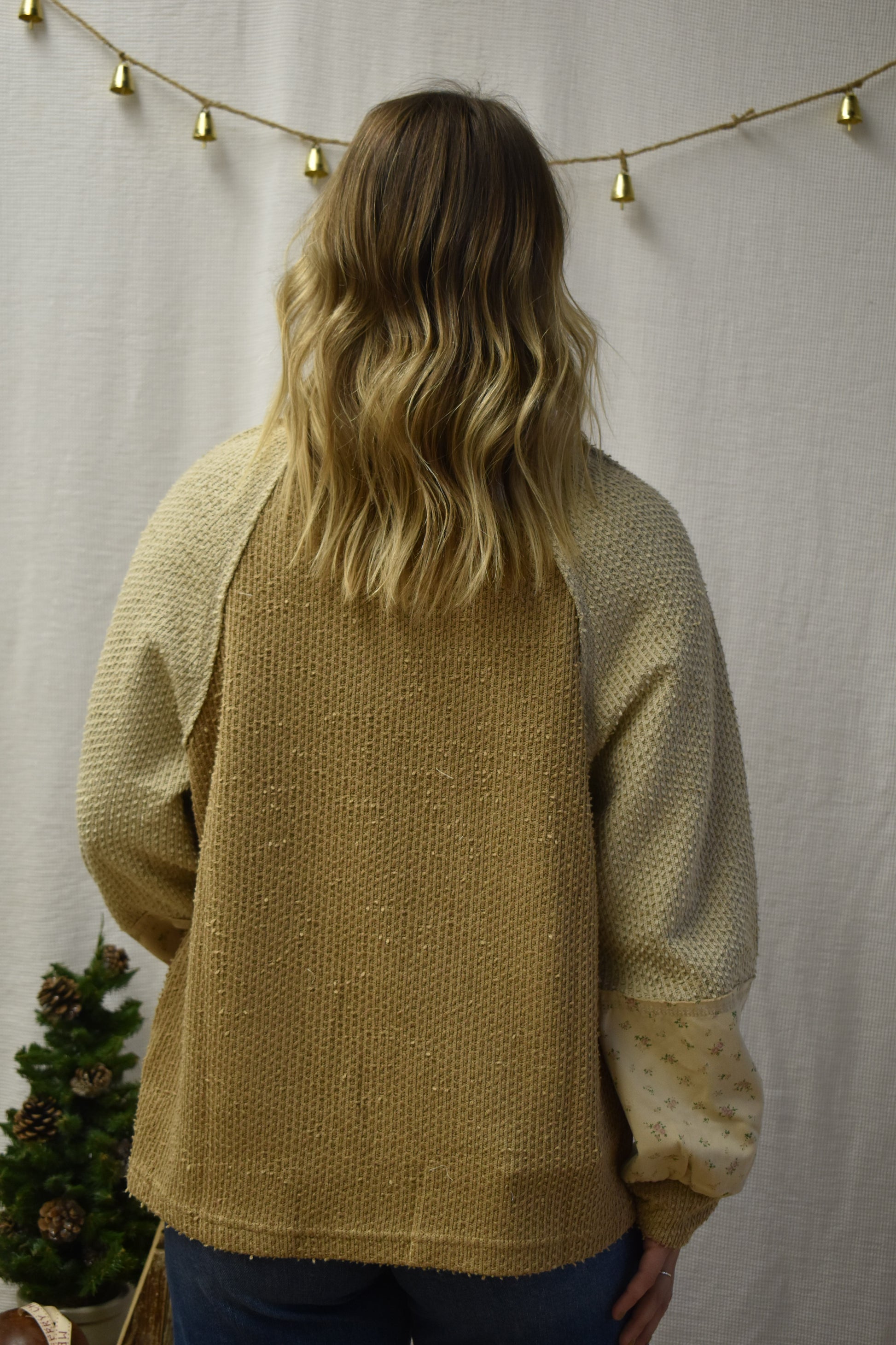 Long sleeve, color block textured knit top. Adorable floral detailing on sleeve & neckline.