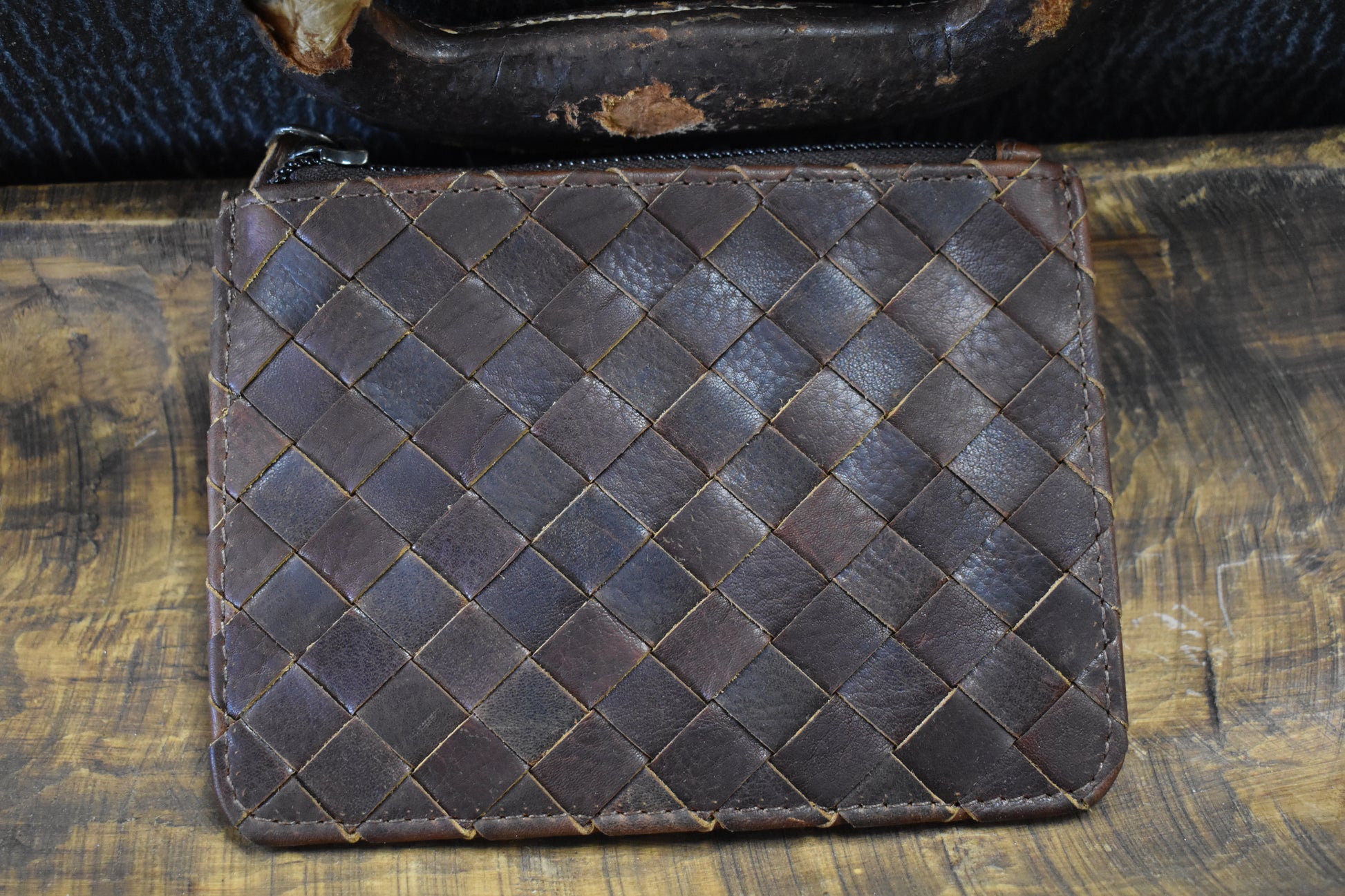 Leather wallet pouch with zipper closure, card slots & interior zippered pocket.