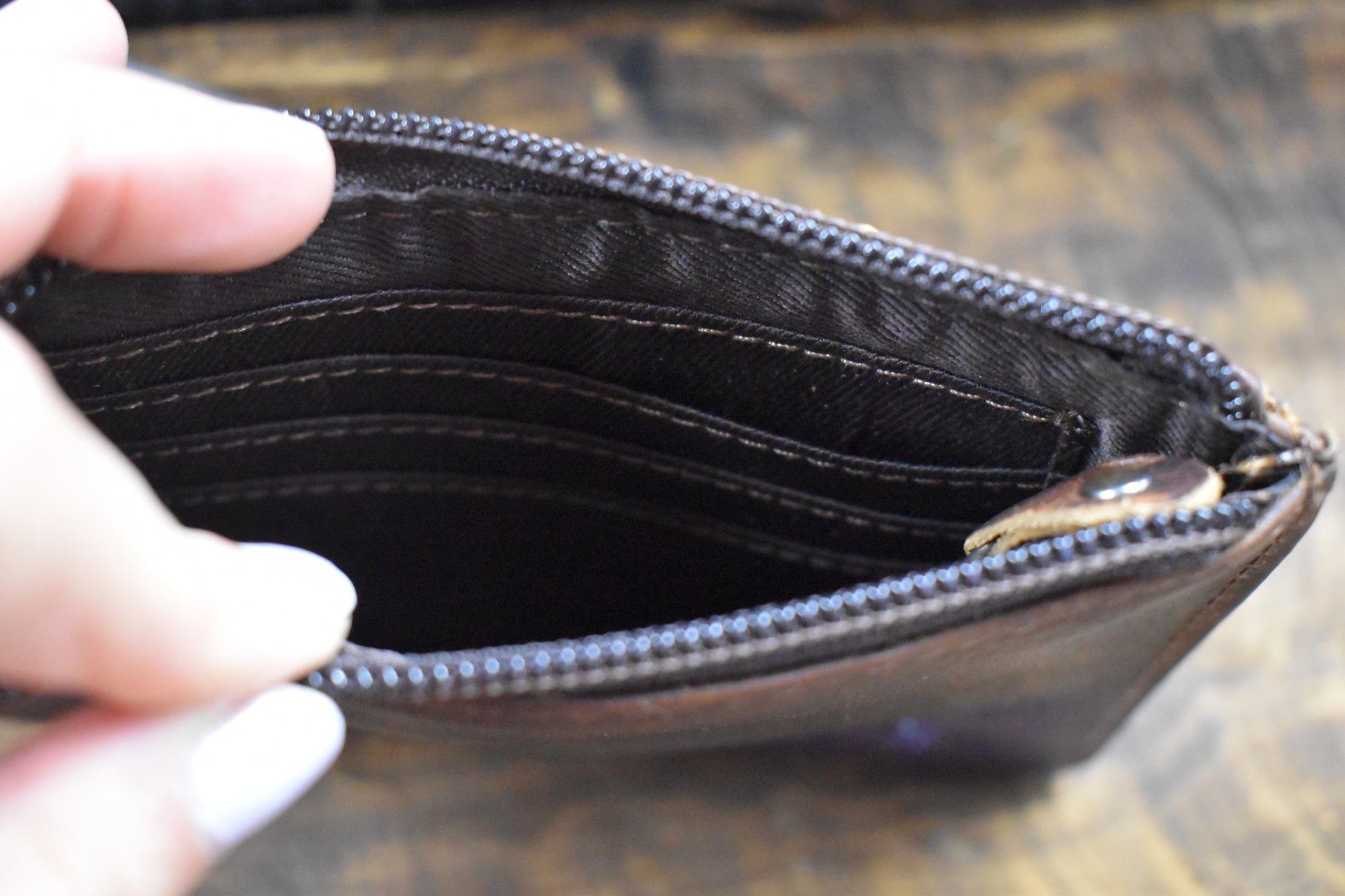 Leather wallet pouch with zipper closure, card slots & interior zippered pocket.