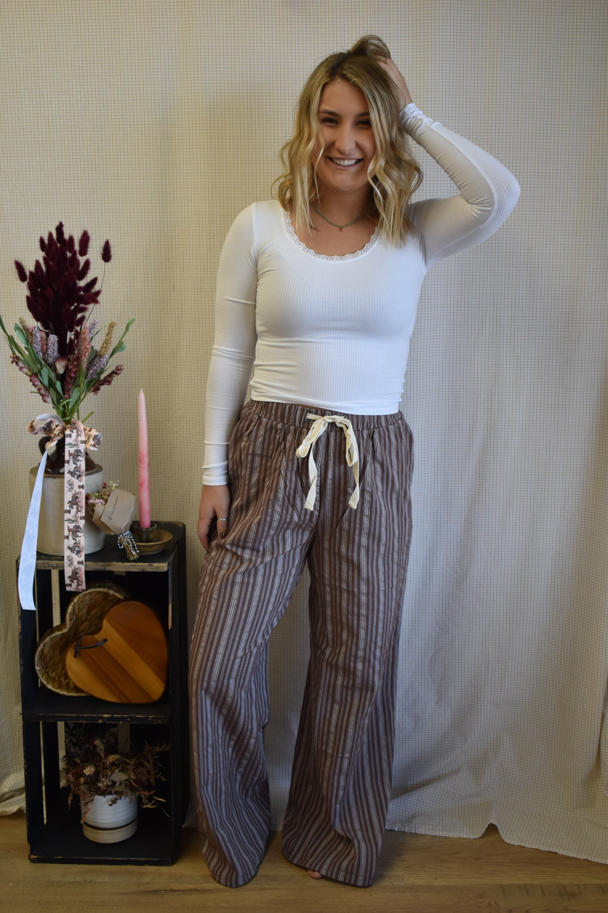 Maroon contrast, stripped wide leg pant with functional drawstring & front pockets.