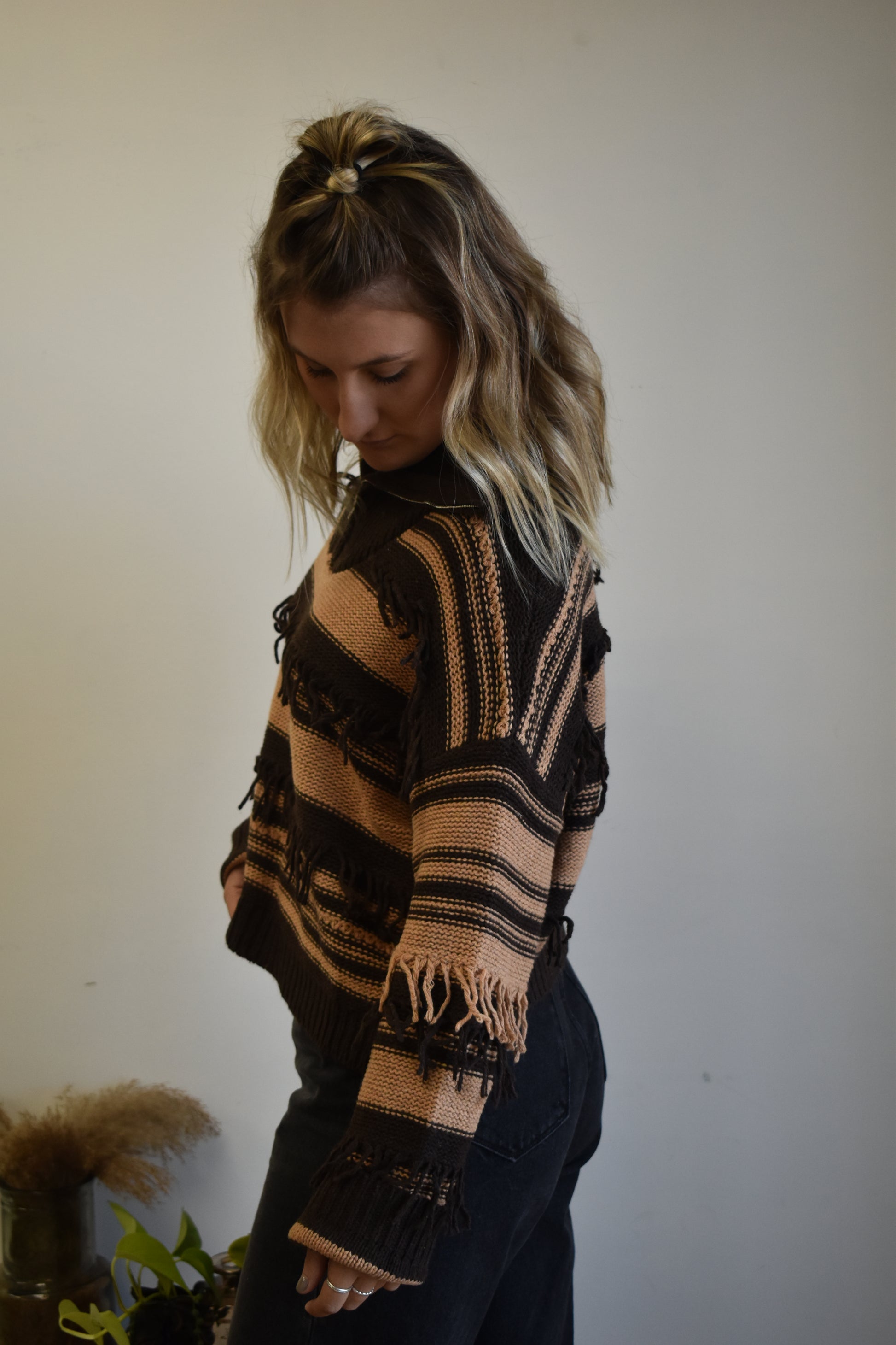 Knit, quarter zip, collared sweater, with color block stripes and fringe detailing.
