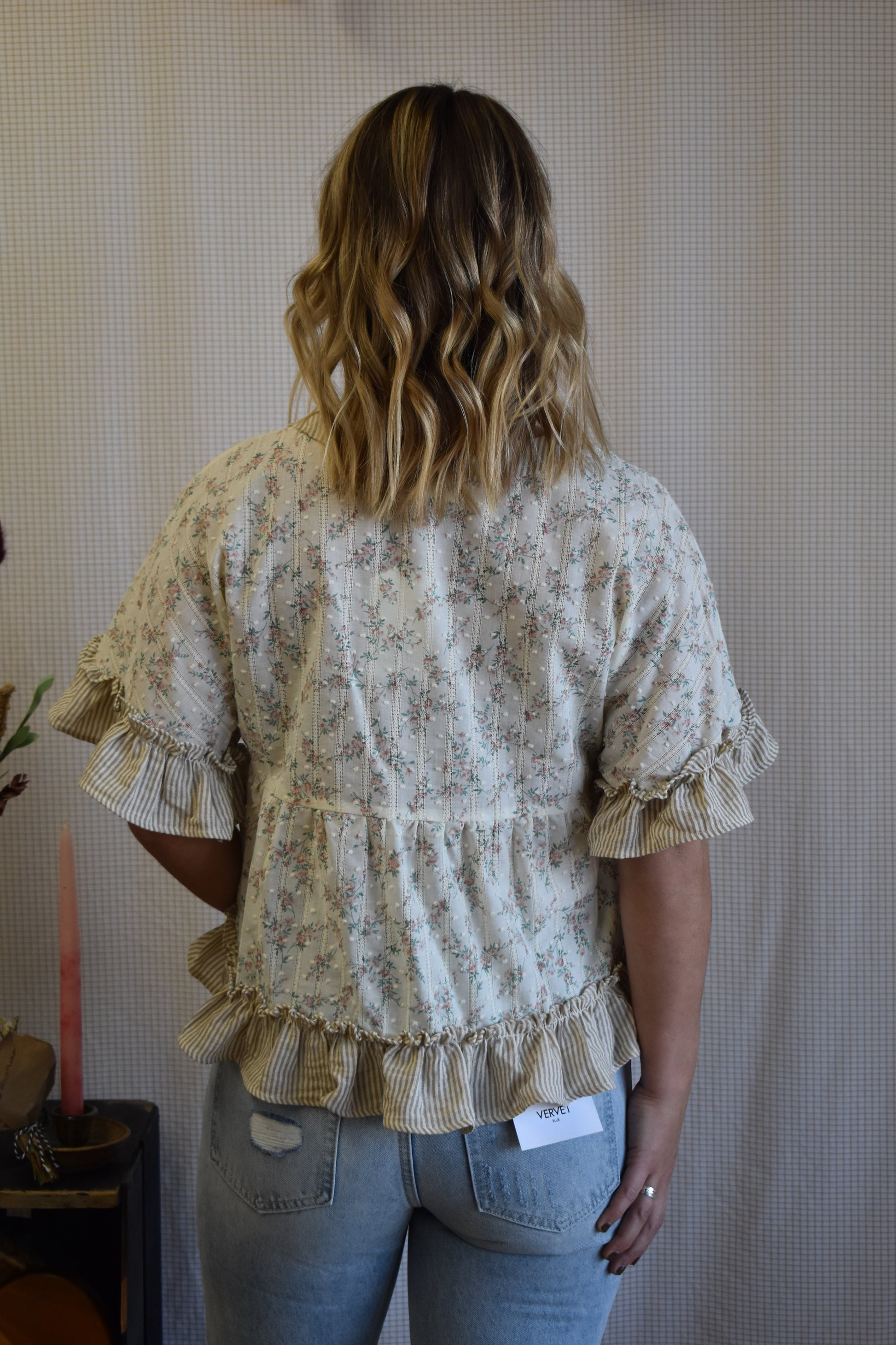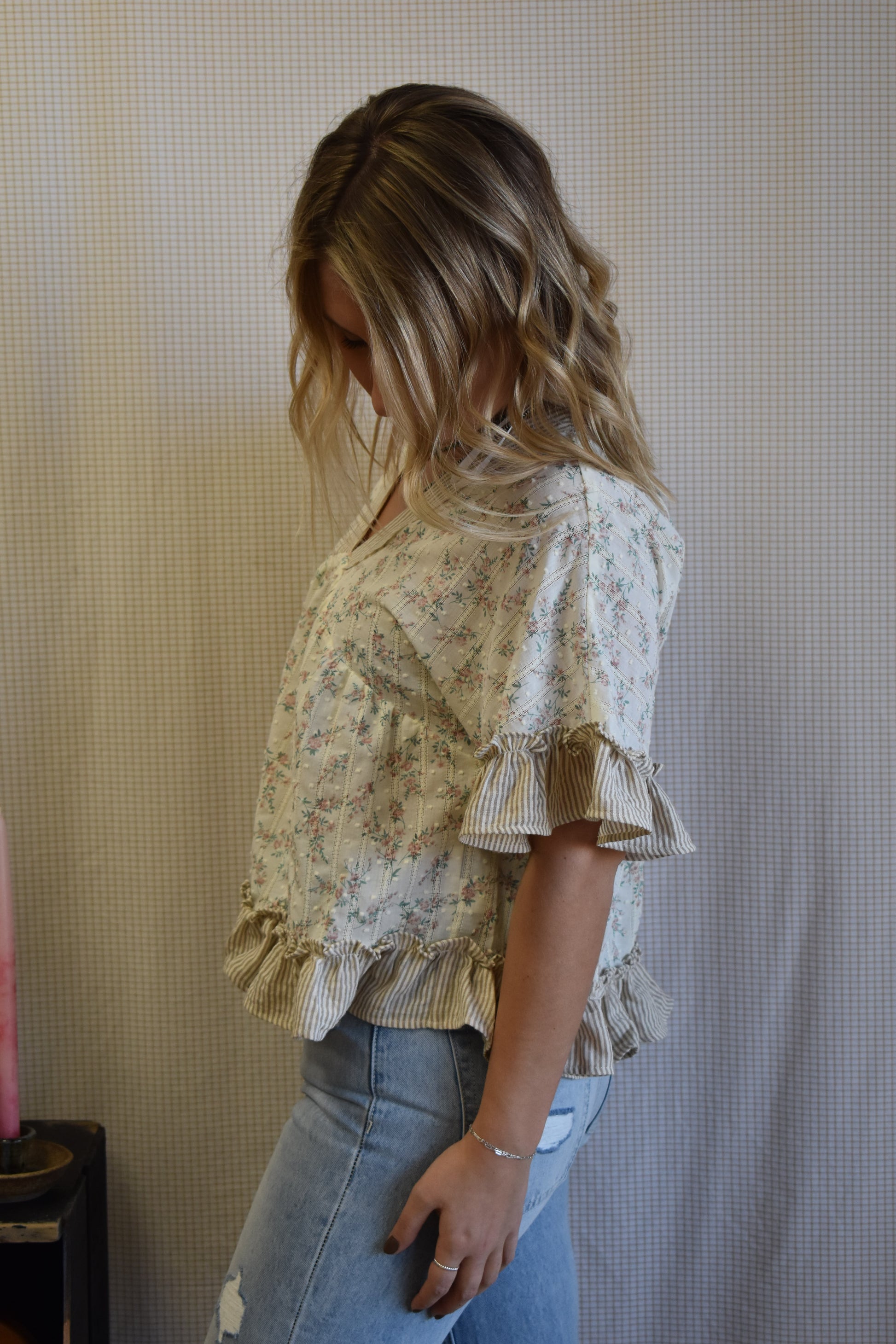 Pinstriped ruffle trimmed floral blouse with v-neckline, adorable babydoll top that hit right below your jeans. A tiny bit sheer.
