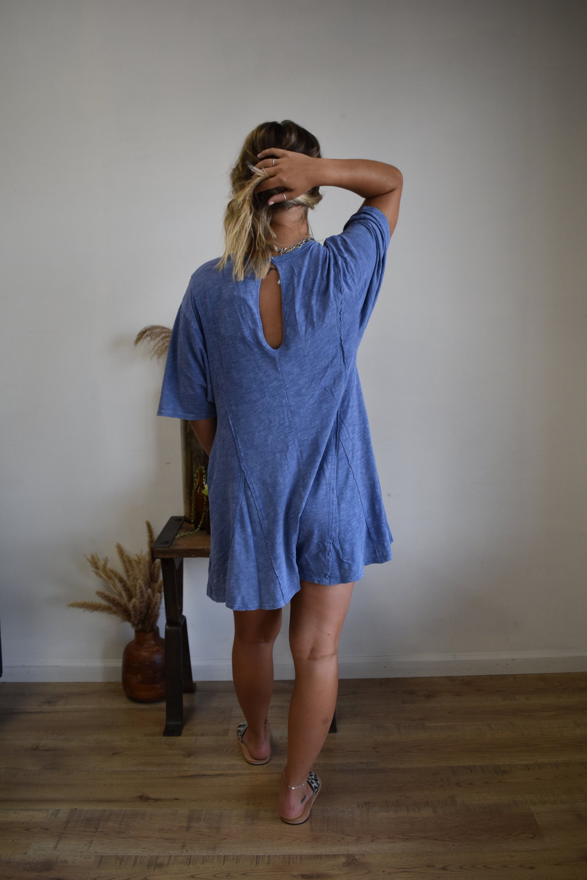 Mineral washed oversized raw hem romper, two hidden side pockets, swoop neck, button fastener high back, sewn pleated details from waist down.