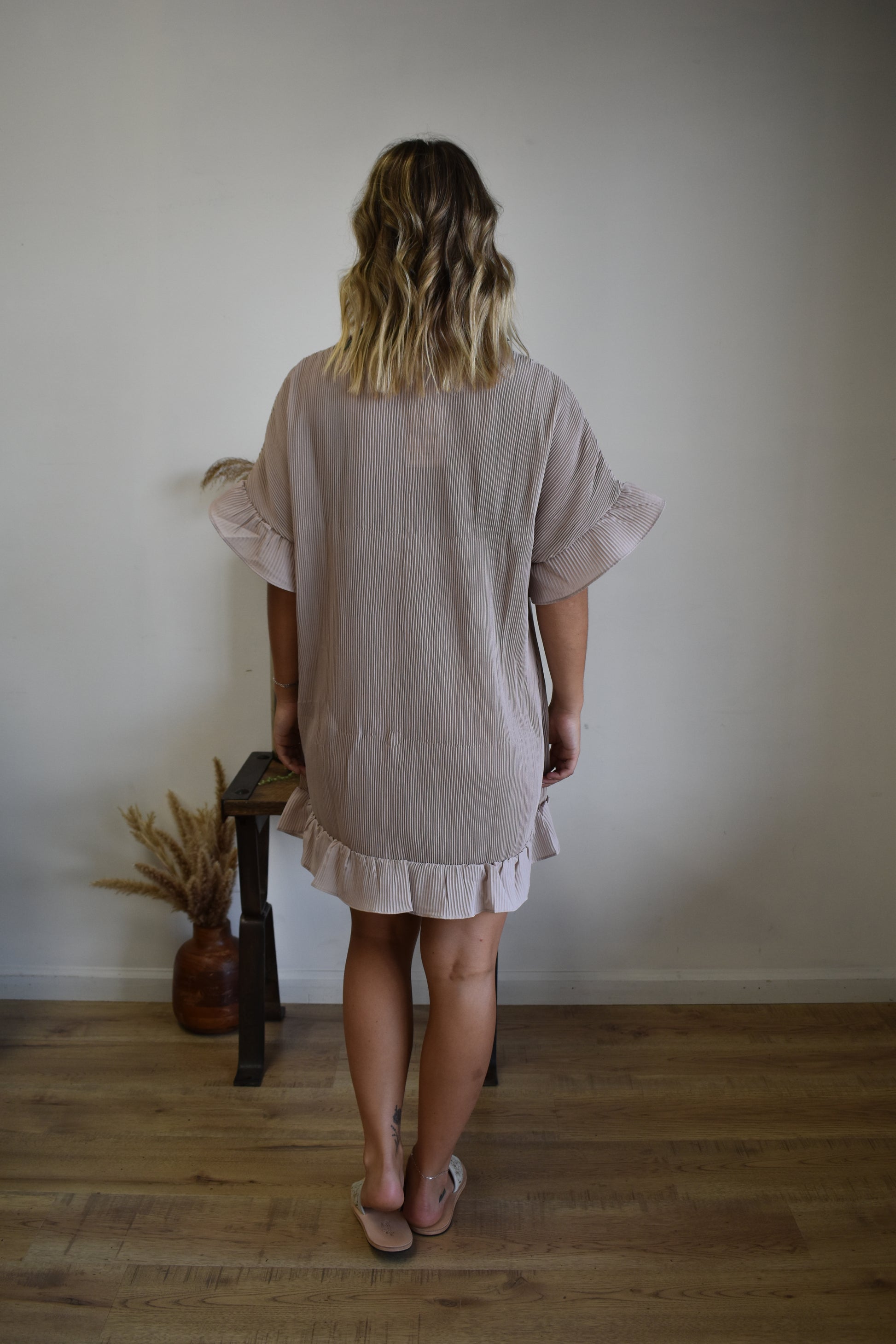 Nude colored, pleated detail, button down mini dress. Short sleeve with ruffled hem detailing & collared neckline.