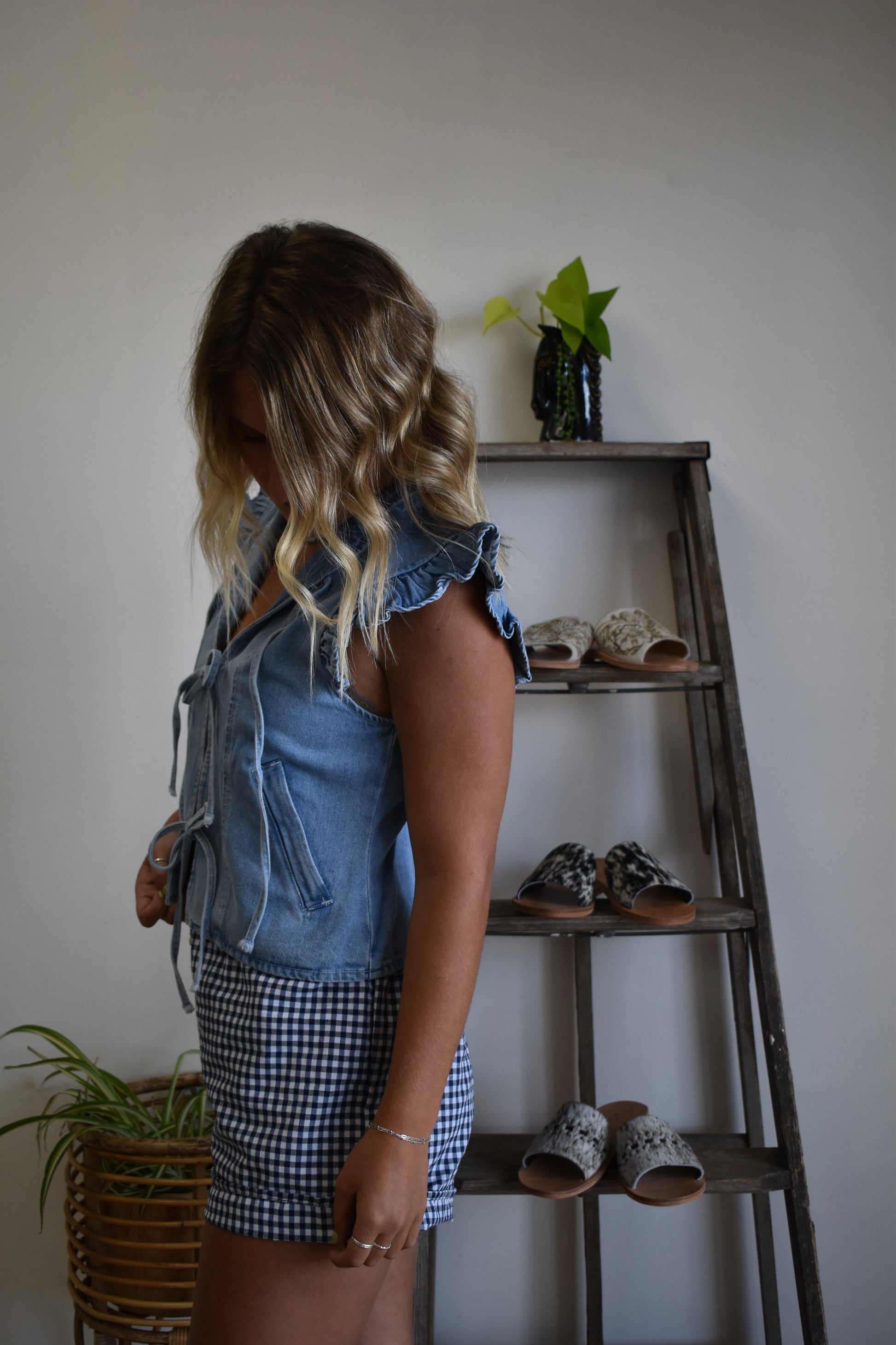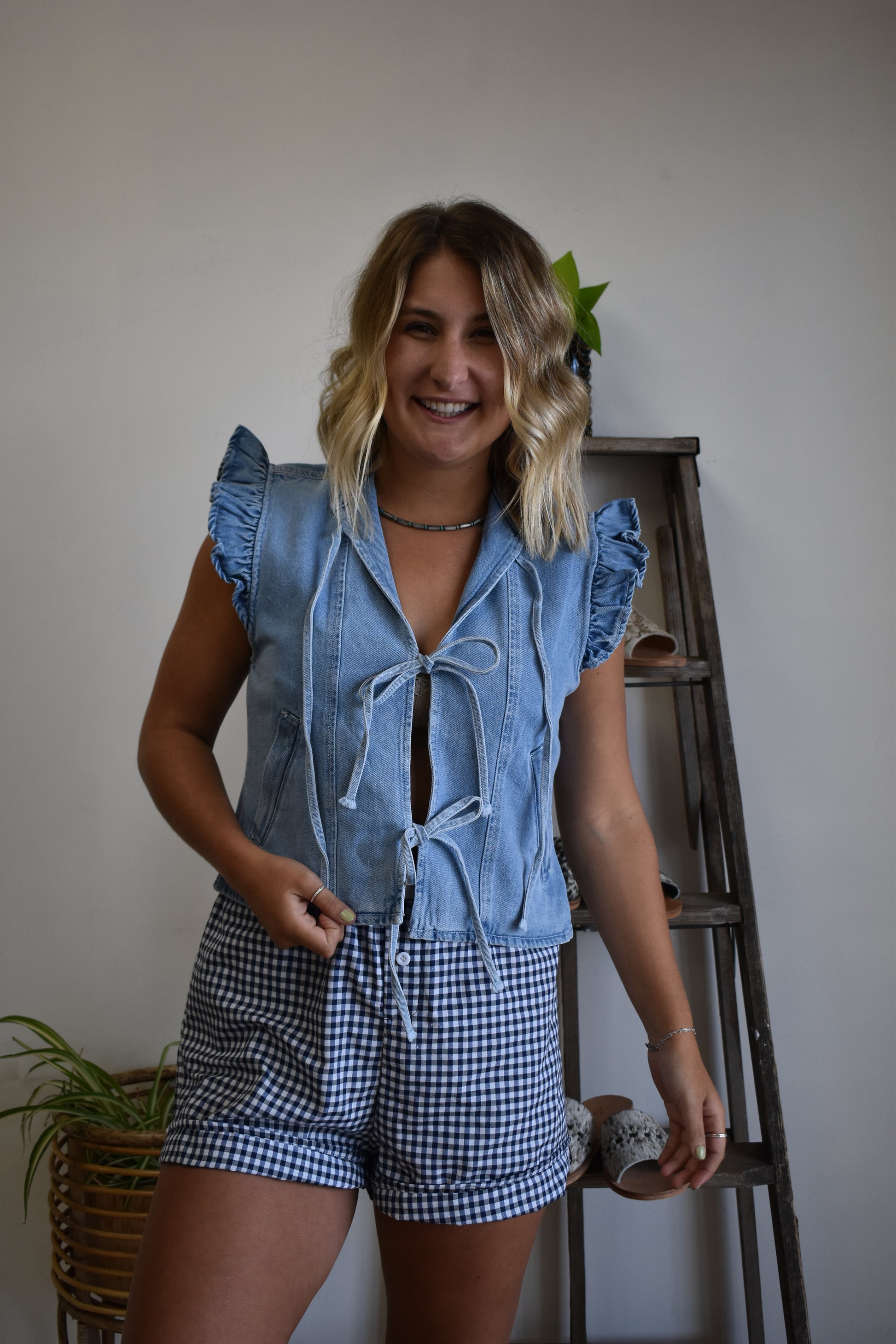 Triple front tie denim vest with thick tank strap ruffle edging and two front hip sewn pockets.
