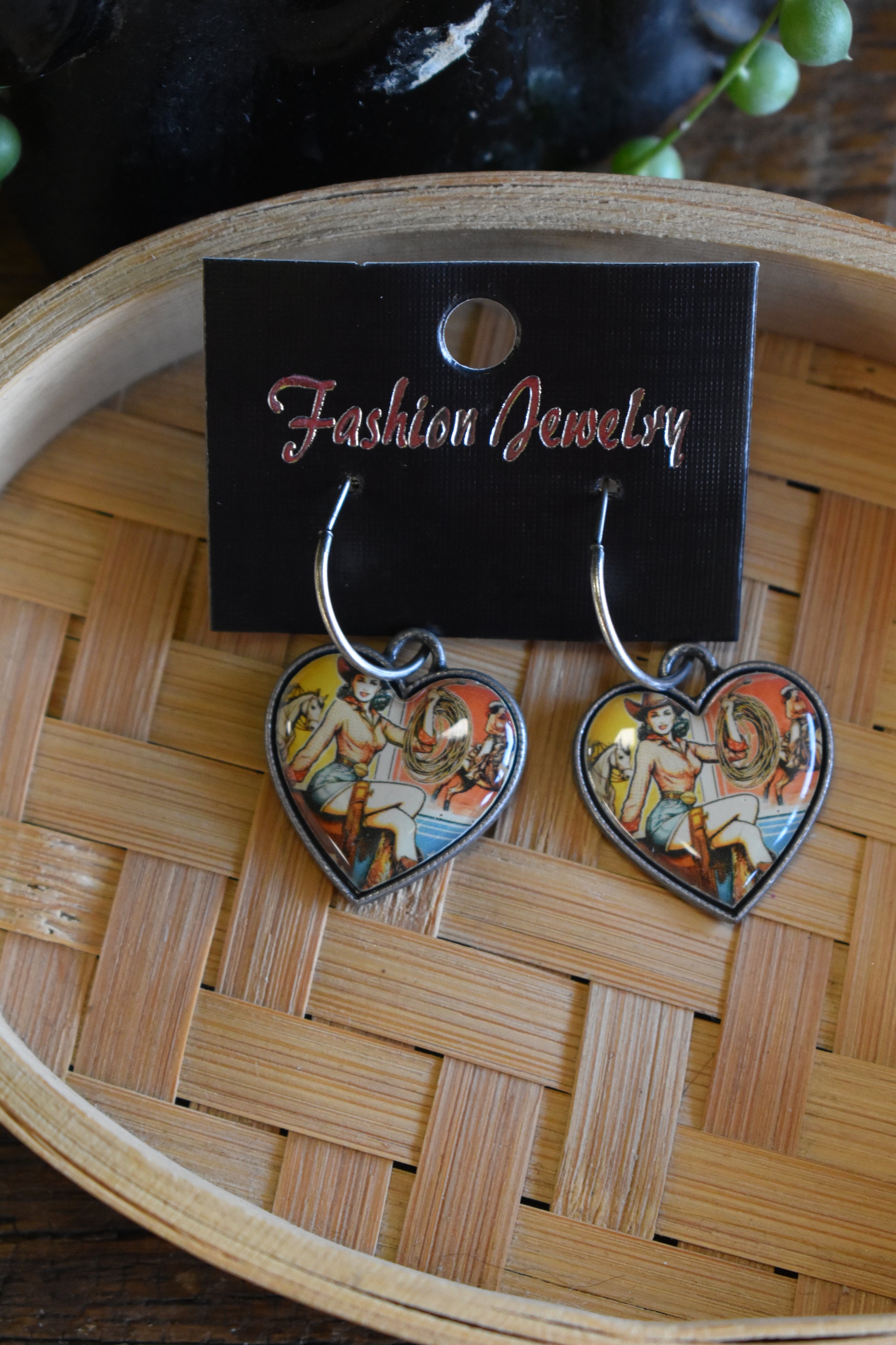 Super light weight adorable hoop stud back earrings with western vintage image.